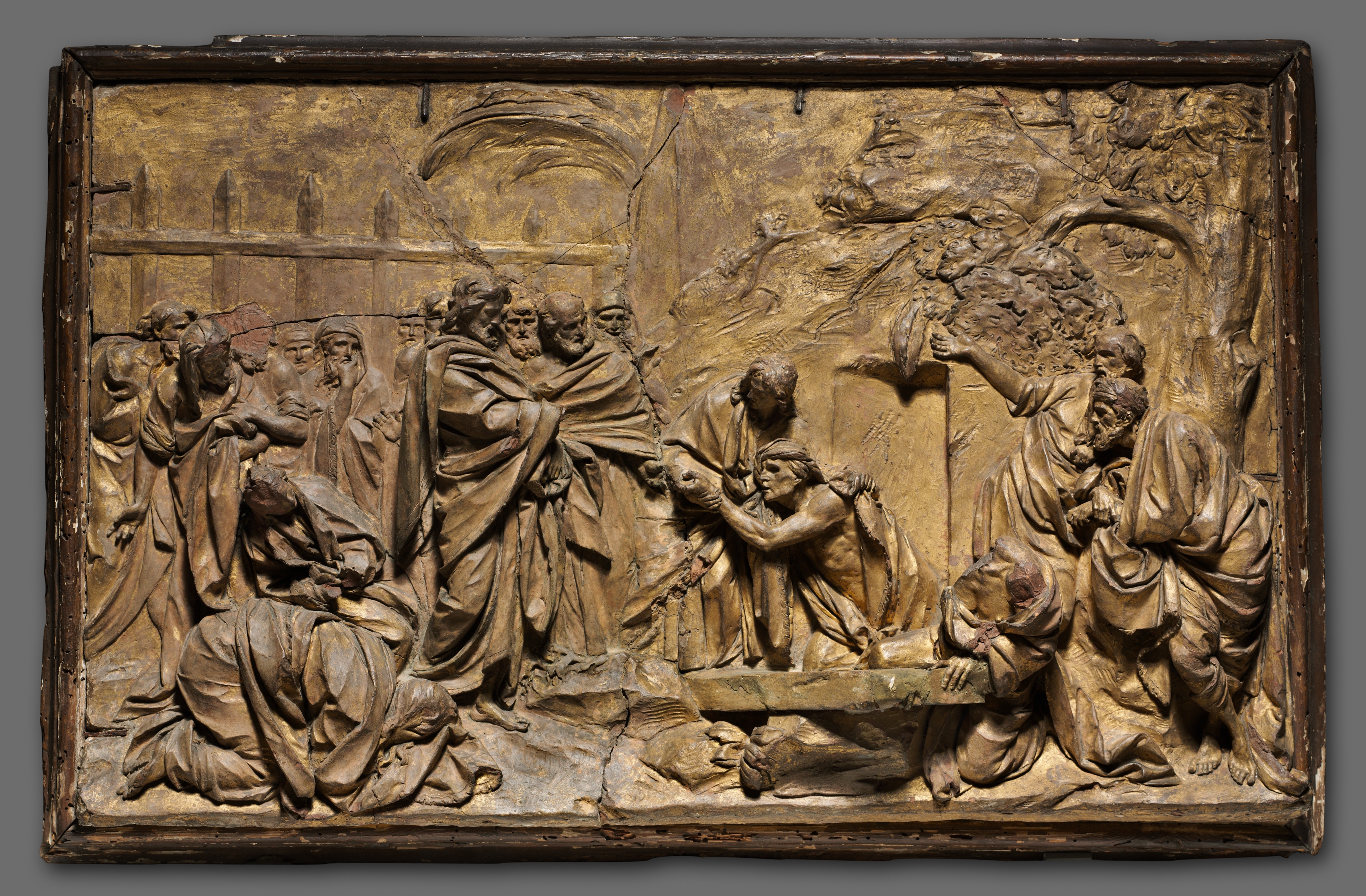 The Raising of Lazarus by Marcantonio Raibolini. A rectangular bronze relief depicting a biblical scene. The artwork features a cracked and worn gold-brown patina. A thick dark wooden frame surrounds the relief. The relief shows Jesus Christ standing on the right side raising his right arm and pointing to a man emerging from a tomb on the center-right. The man, Lazarus, is wrapped in cloth and assisted by two men. A group of onlookers surrounds them, some with expressions of surprise, others concern. The background on the left features buildings with spires and an archway through which a figure exits. A tree with a gnarled trunk is on the right. The panel's surface is cracked in several places.