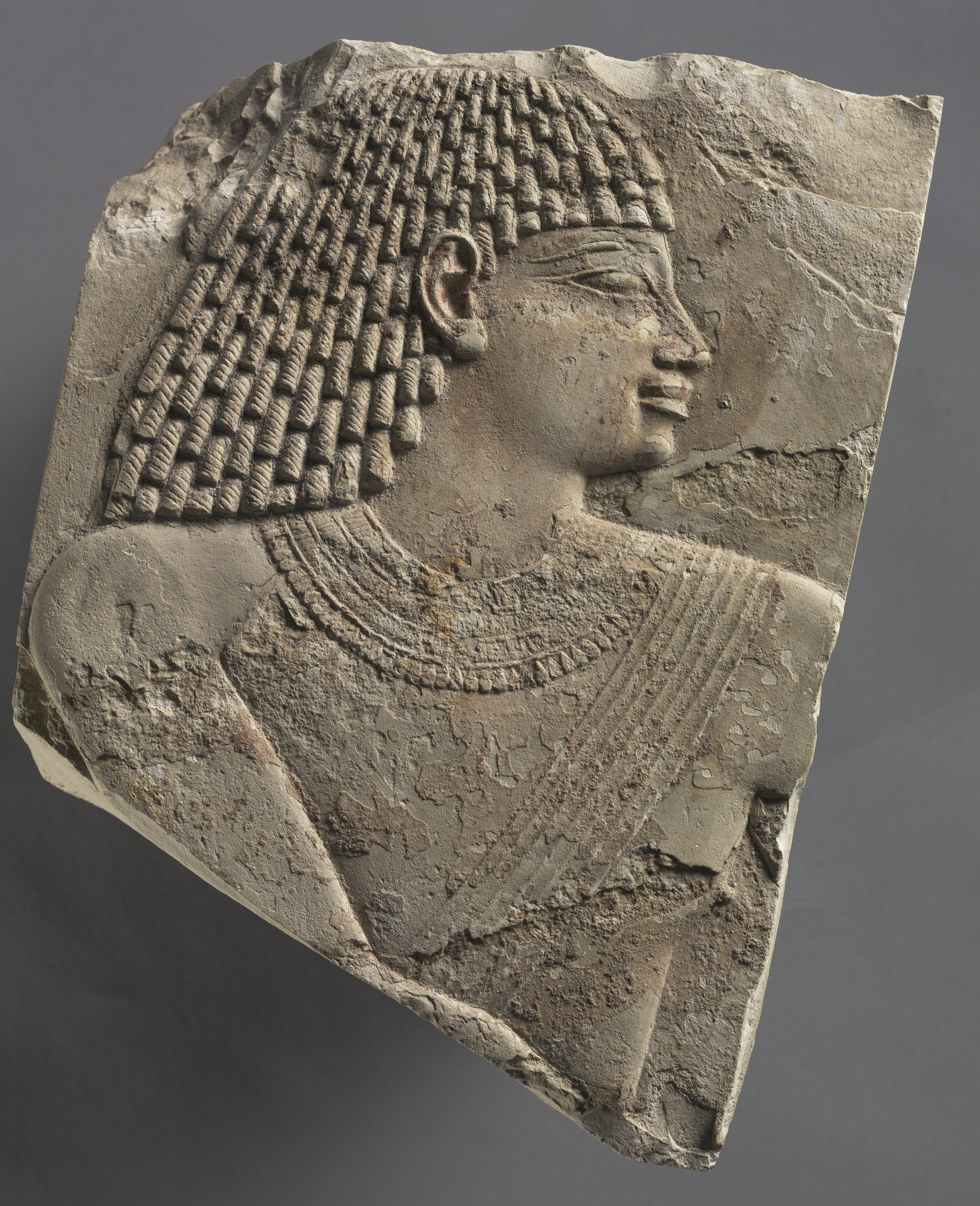 The sculpture "Small Head of a Man" by an unknown artist depicts a man's head in profile, facing right. The head and shoulders are carved from a single piece of stone, with rough, unpolished edges. The man's head is tilted slightly forward, with the chin pointing down. He has a long, straight nose, thin lips, and small, closed mouth. His eyes are depicted with the eyelids and irises carved. The man has tightly curled, short hair. He wears two necklaces. The top one has flat beads; the bottom one has tubular beads. A curved line etched on the chest may indicate an arm or a fold of clothing. The sculpture appears to be ancient, likely from Egypt. The background of the image is dark gray.