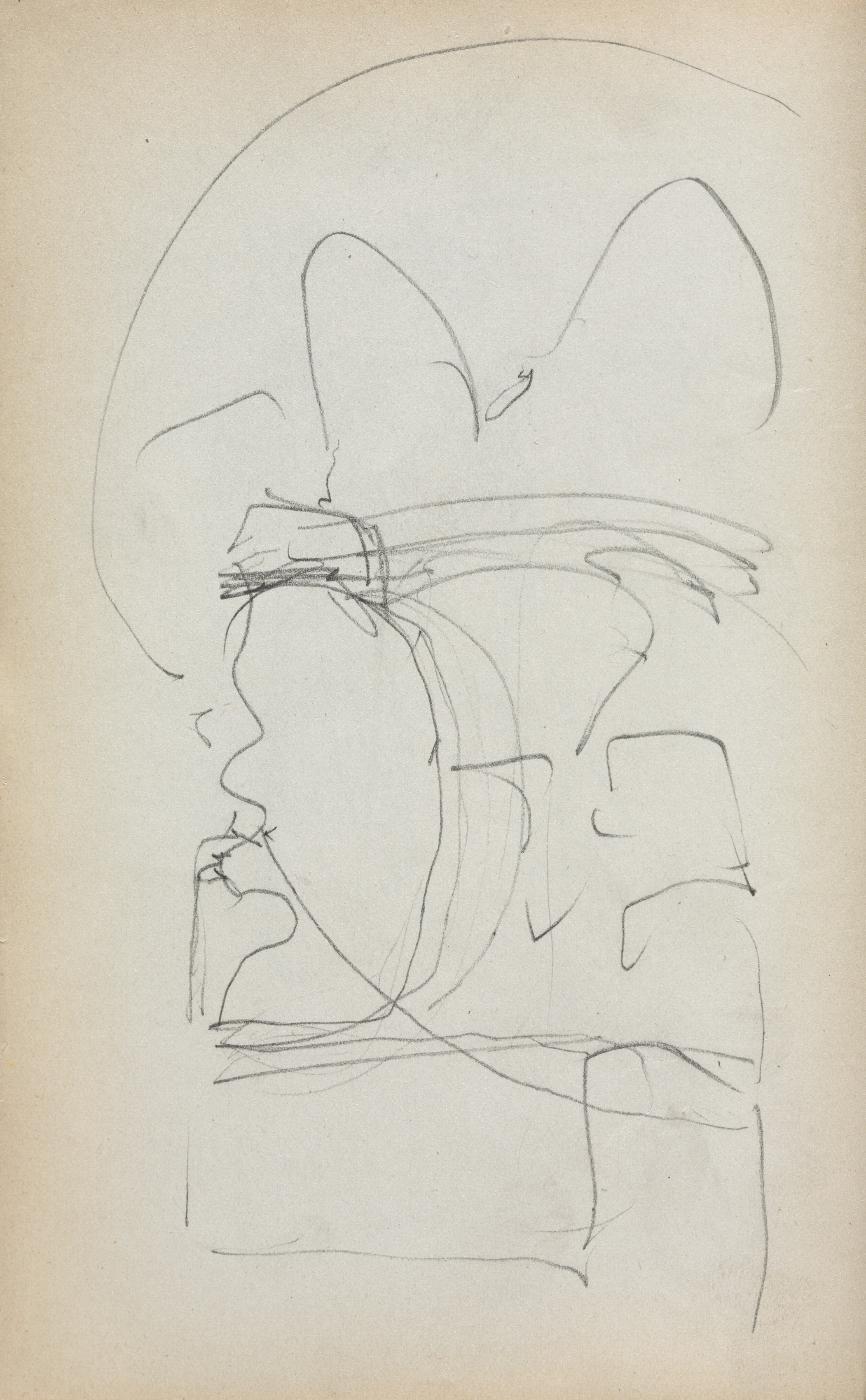 The image depicts a simple pencil sketch on off-white paper with darker edges. The sketch is an abstract drawing, primarily featuring curved and straight lines. It appears to contain a side profile of a person's face; the face is drawn in profile, facing left. The profile has a large hat or head covering. The facial features are minimal, with only a nose and mouth indicated. The background of the sketch is the off-white color of the paper, with no additional details or shading. The overall style of the sketch is loose and expressive, with many overlapping lines. The sketch takes up most of the page, but there is a significant border around it.