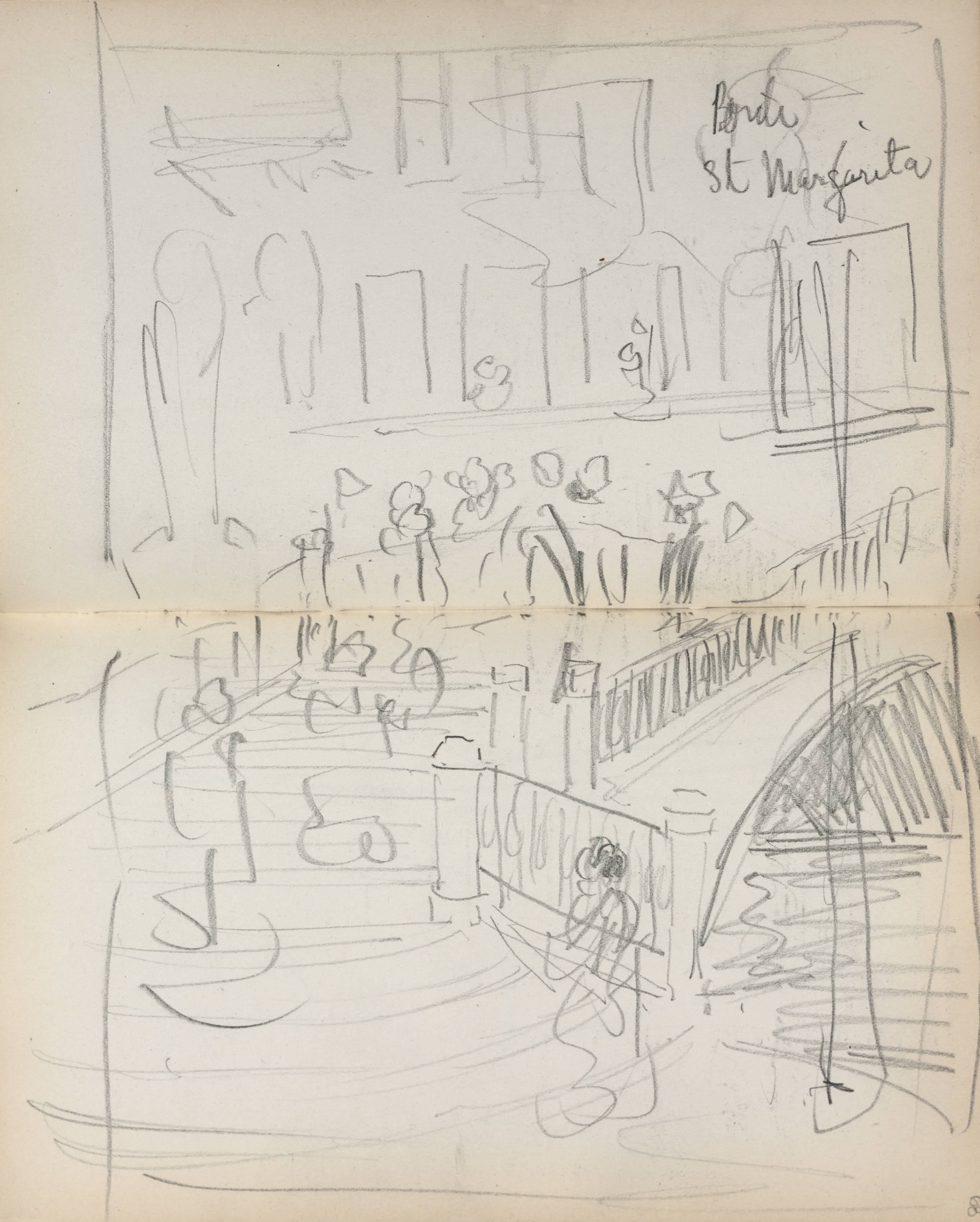 The image shows a sketchbook page with two pencil drawings. The top drawing depicts a building with a row of columns and a flat roof. People are standing on a patio in front. The words "Bridge St Margherita" are written on the upper right. The bottom drawing shows a bridge with a railing and an arch. A figure is standing on the bridge, looking out over the water. The background of both drawings is a light beige color, suggesting aged paper. The drawings appear to be quick sketches, with loose lines and minimal detail.