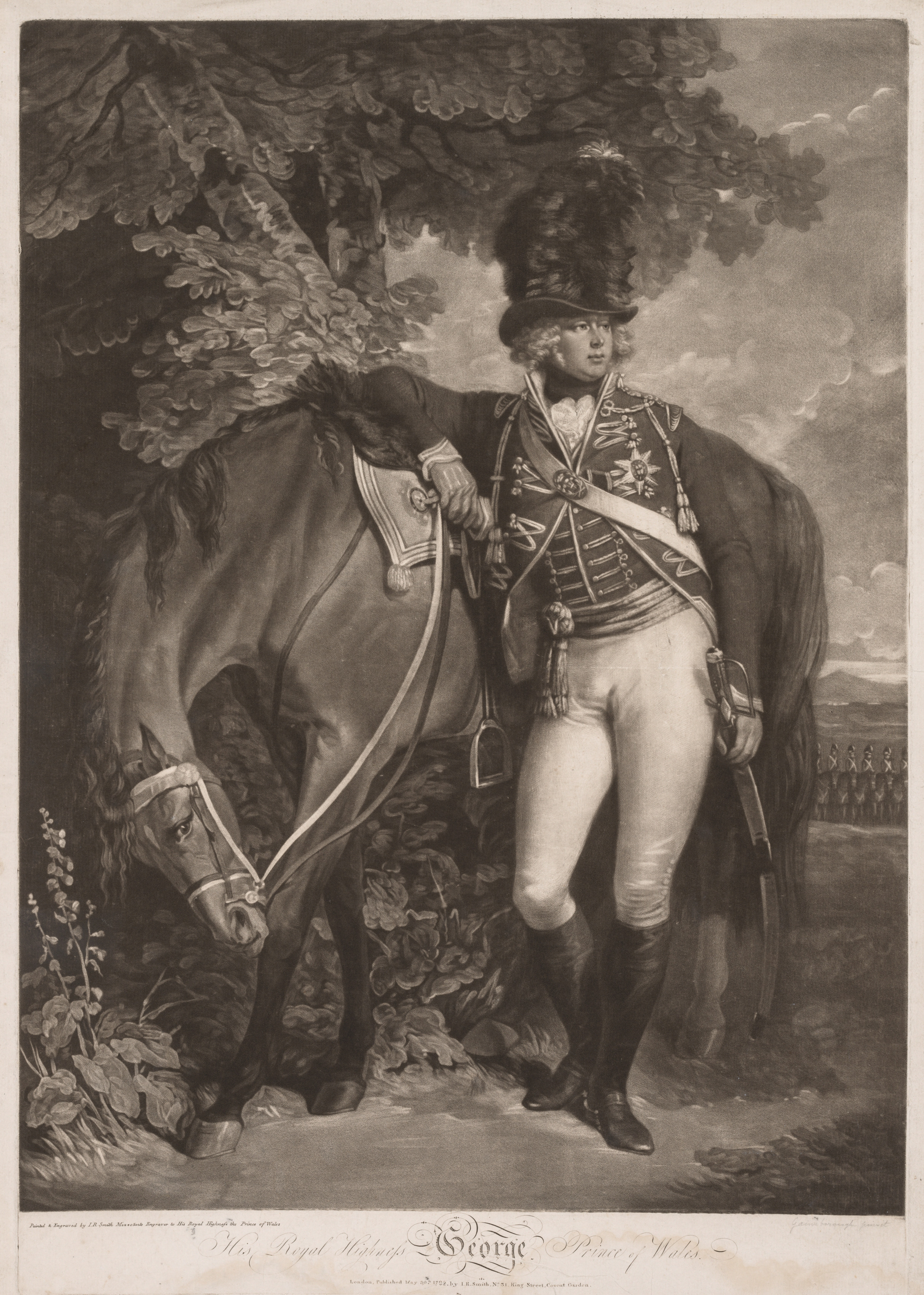 Black and white image of a man in military uniform standing next to a horse. The man is wearing a tall hat with a feather, a dark jacket with gold trim and medals, white pants, and tall black boots. A white sash crosses his body. The man has light-colored curly hair. He is standing with his left hand on the reins of a dark-colored horse. The horse's head is facing down. There are trees and foliage behind them. In the background, there appears to be a line of soldiers. At the bottom of the image, there is text that reads "George Prince of Wales".