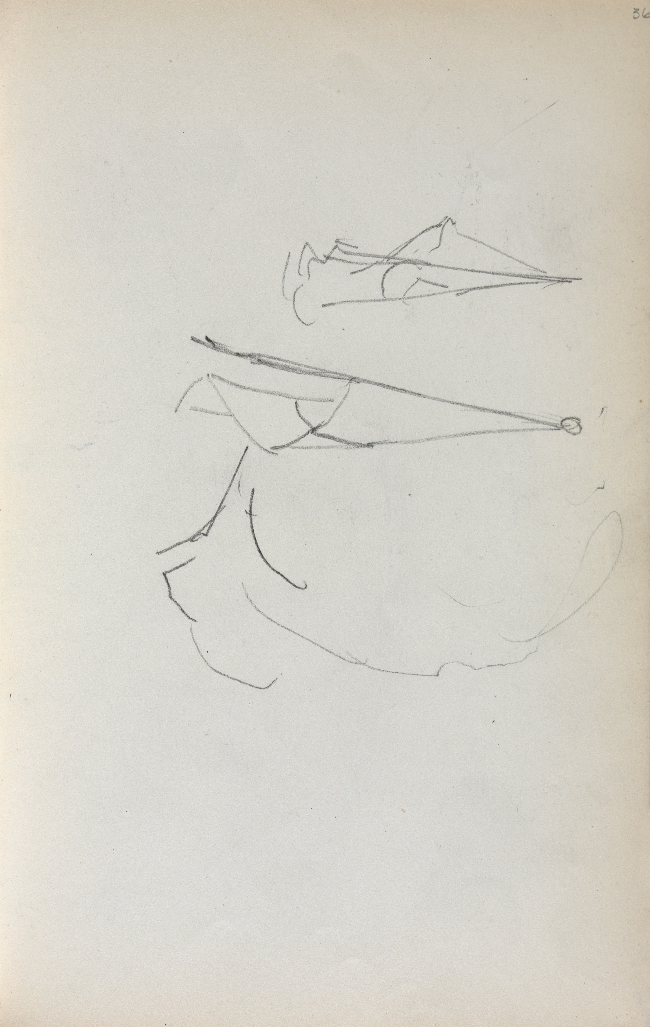 Pencil sketch on beige paper, two boats drawn. The boat at the top is drawn with minimal lines, with triangular bow, short mast, and short lines indicating a person seated. The boat at the bottom is drawn with more lines, showing a curved hull, triangular bow, tall thin mast and boom, and a rounded stern. A small circle at the end of the boom. A corner of the page in the upper right has a small number '36'.