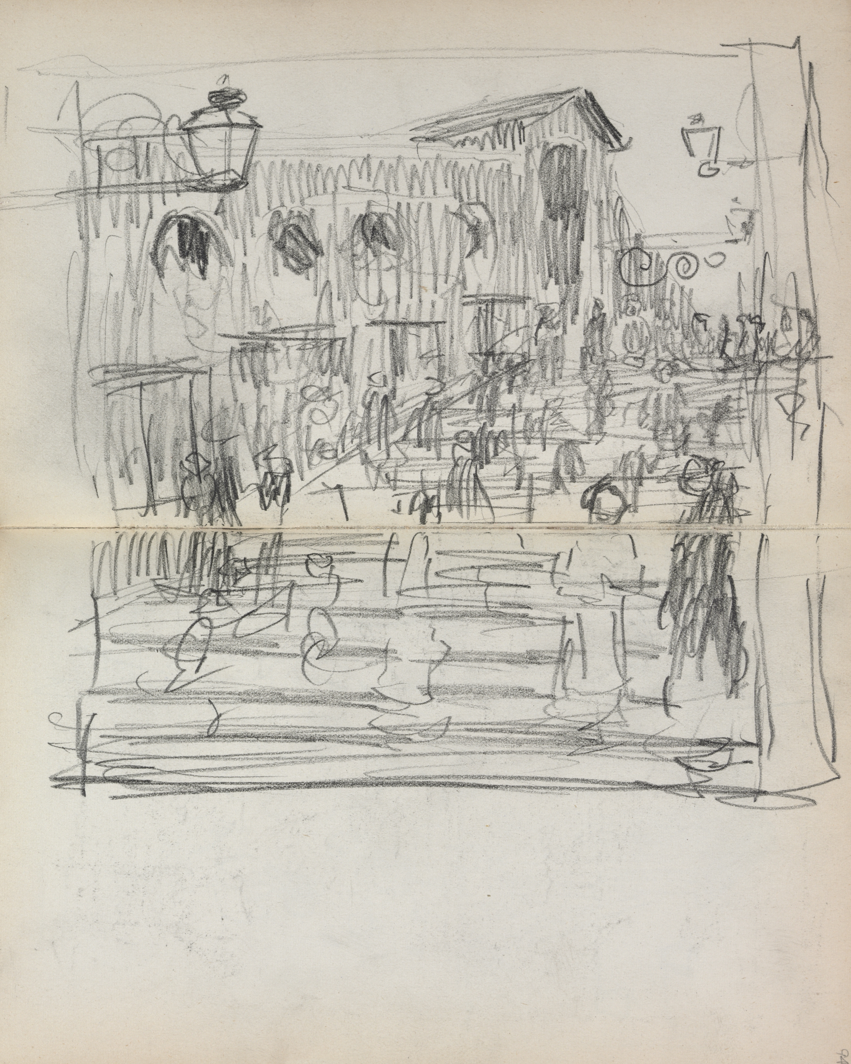 Pencil sketch on off-white paper of a bridge scene with people. The drawing spans two pages, with a horizontal crease down the middle. The top half depicts a building with three arched openings, possibly windows or doorways. A lantern-style light fixture is drawn on the left side of the building. A similar light fixture is on the right side. A slanted roof extends over a balcony or walkway. The bottom half appears to show a bridge, with lines suggesting the presence of water below. Several figures are scattered throughout the scene but are not clearly defined due to the sketchy nature of the drawing. The overall style is loose and expressive.