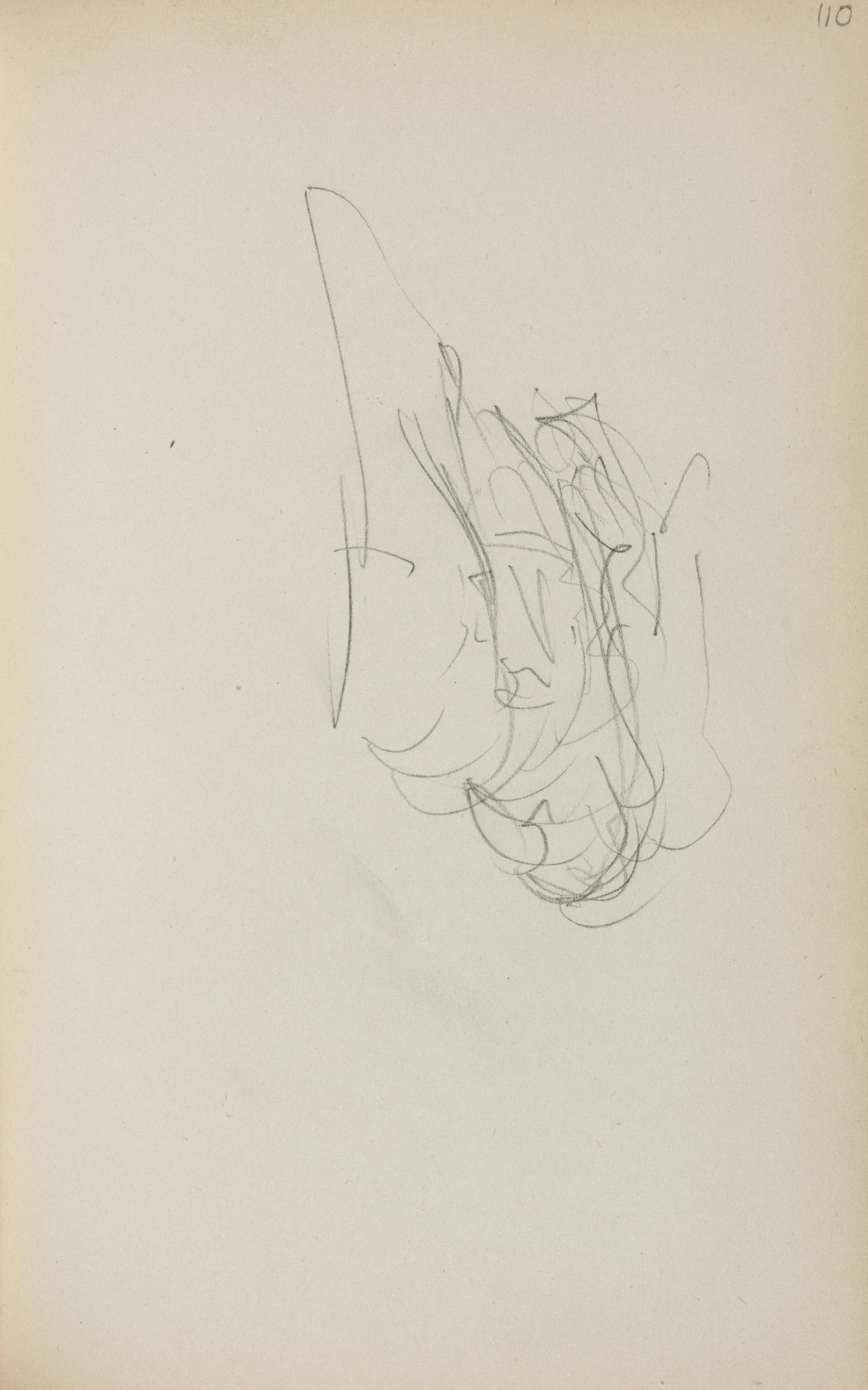 Pencil sketch on aged paper, central sketch of a boat or gondola, viewed from side, curved and tapered shape with pointed bow, simple lines, minimal details, page number "110" in top right corner.