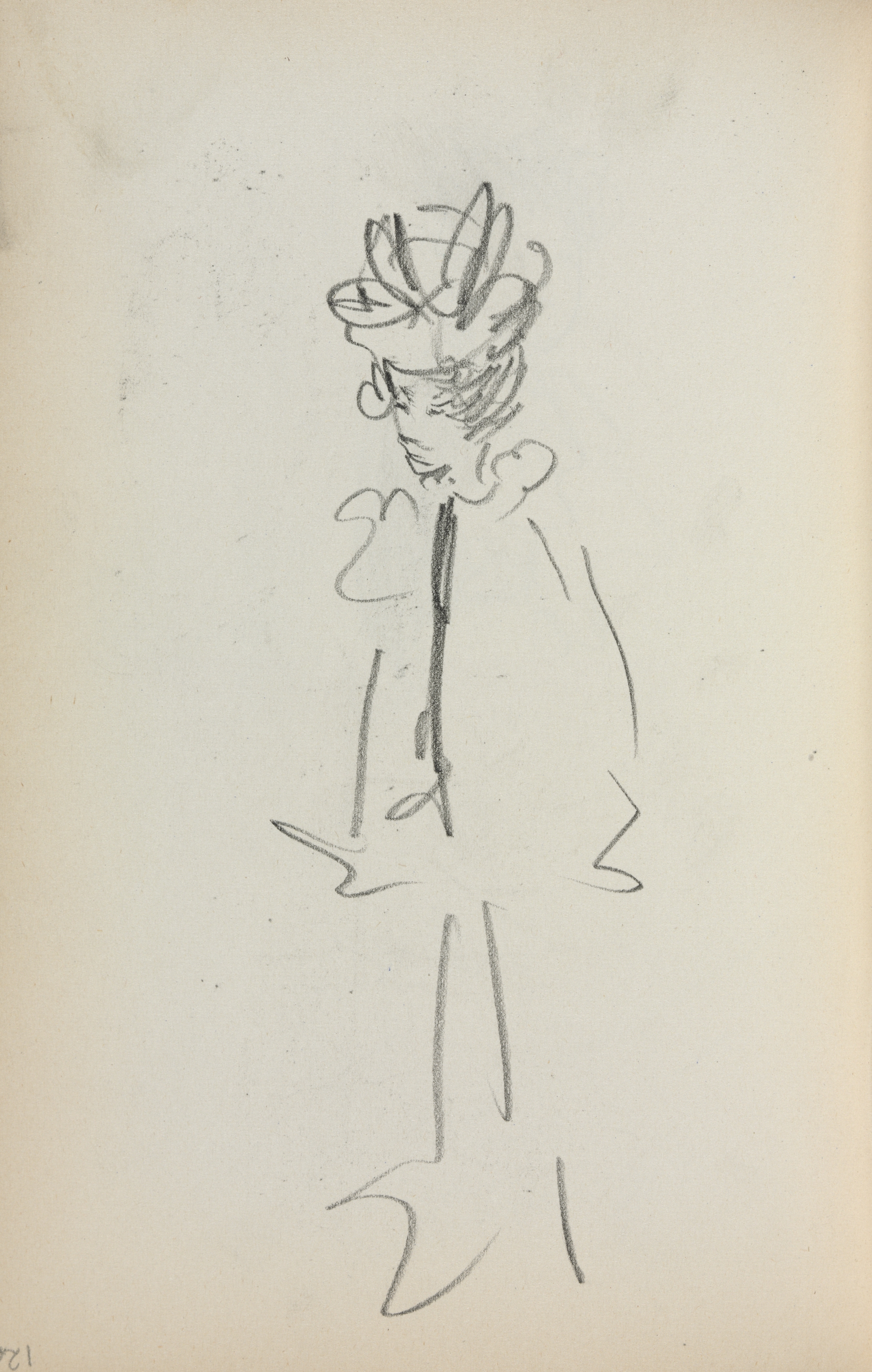 The image shows a sketch of a woman in a three-quarter view. The woman is drawn in pencil on off-white paper. She faces slightly left and is wearing a large hat with feathers. Her facial features are minimal, with only a small indication of eyes, nose, and mouth. She appears to be wearing a coat with a high neckline and long sleeves. The body and limbs are drawn with loose, expressive lines. The background is the off-white paper with some darker spots and discoloration around the edges.