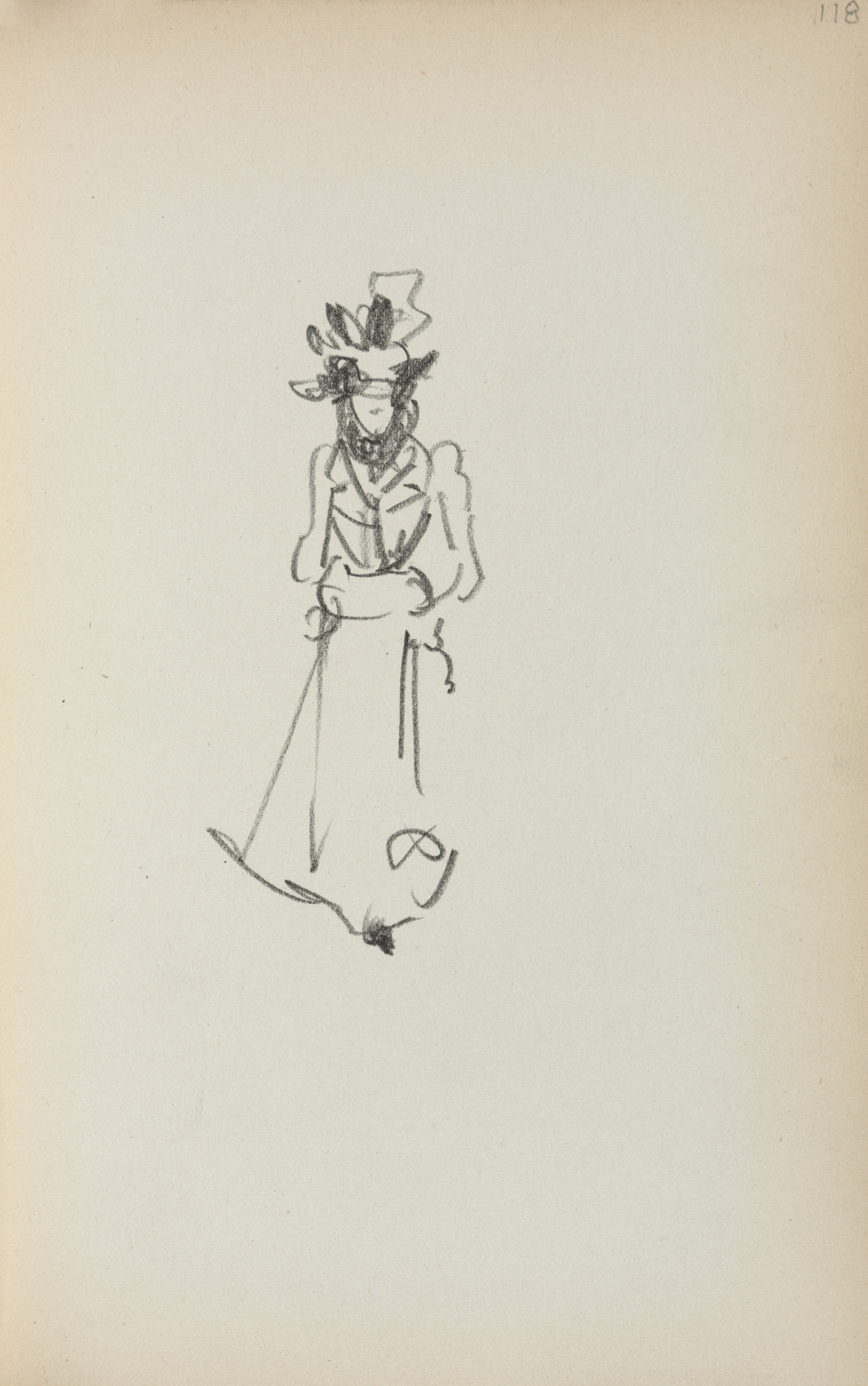 The sketch depicts a woman standing. She wears a long dress and a hat adorned with feathers. Her hands are positioned near her waist. The woman's face is largely obscured. The drawing is rendered in black on a beige background. A small number "118" is visible in the upper-right corner.