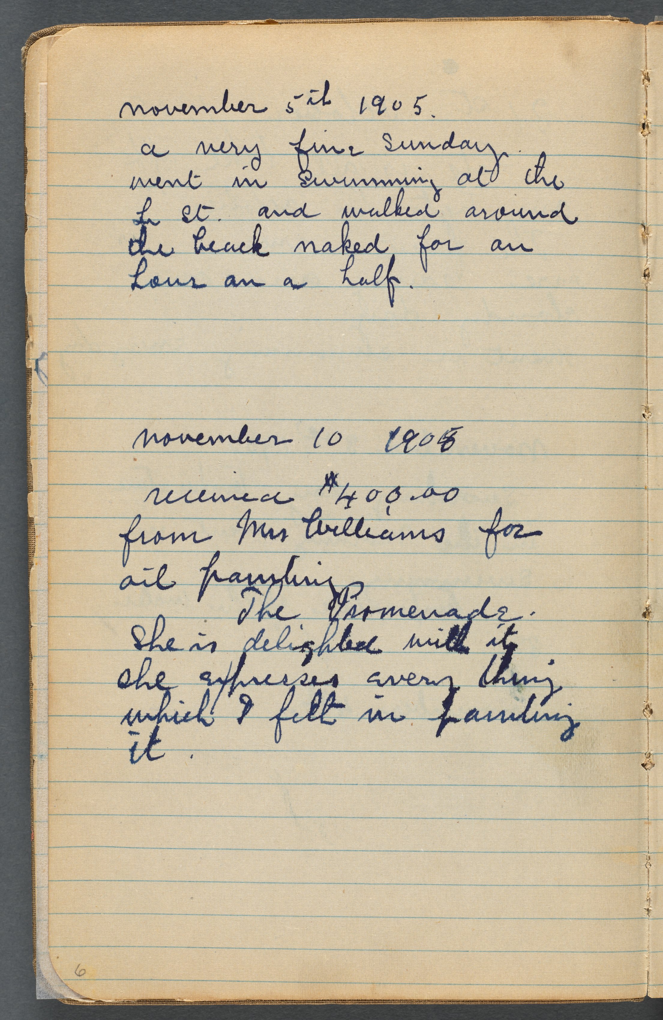 Yellowed lined notebook paper with handwritten text in blue ink. The paper is a light tan color with darker edges and visible wear on the corners. The blue lines are spaced evenly apart. Two dates are written: "November 5th 1905" and "November 10 1905." The handwriting is cursive and includes the following text: "November 5th 1905. A very fine Sunday. Went in swimming at the L et. and walked around the beach naked, for an hour and a half. November 10 1905. Received #400.00 from Mrs Williams for all paintings. The Pomernde. She is delighted with it. She appreciates a very thing which I felt I was lacking." The notebook page is marked "6" in the bottom-left corner.