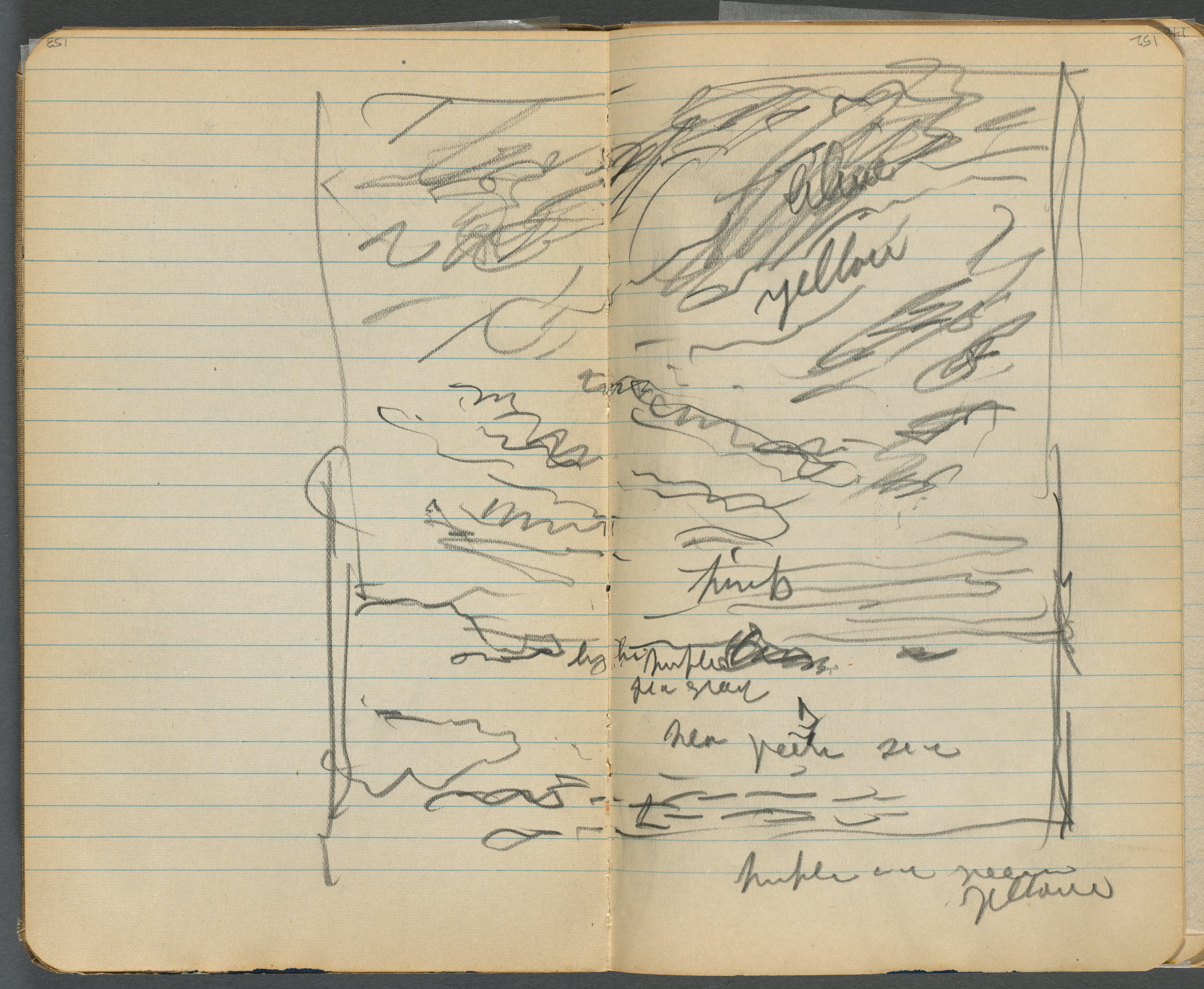 The image shows two pages from a lined notebook, possibly a sketchbook. The pages are yellowed with age and have rough edges. The pages are filled with pencil sketches of wavy lines that resemble a seascape. The left page has a large, rectangular sketch with wavy lines that could represent the ocean, but there are no clear details. The right page has similar wavy lines and some illegible handwritten text. Some of the text on the right page includes the words "yellow," "blue," "green," and "purple." The handwriting is difficult to read, but it seems to be notes about colors. The background of the image is dark gray.