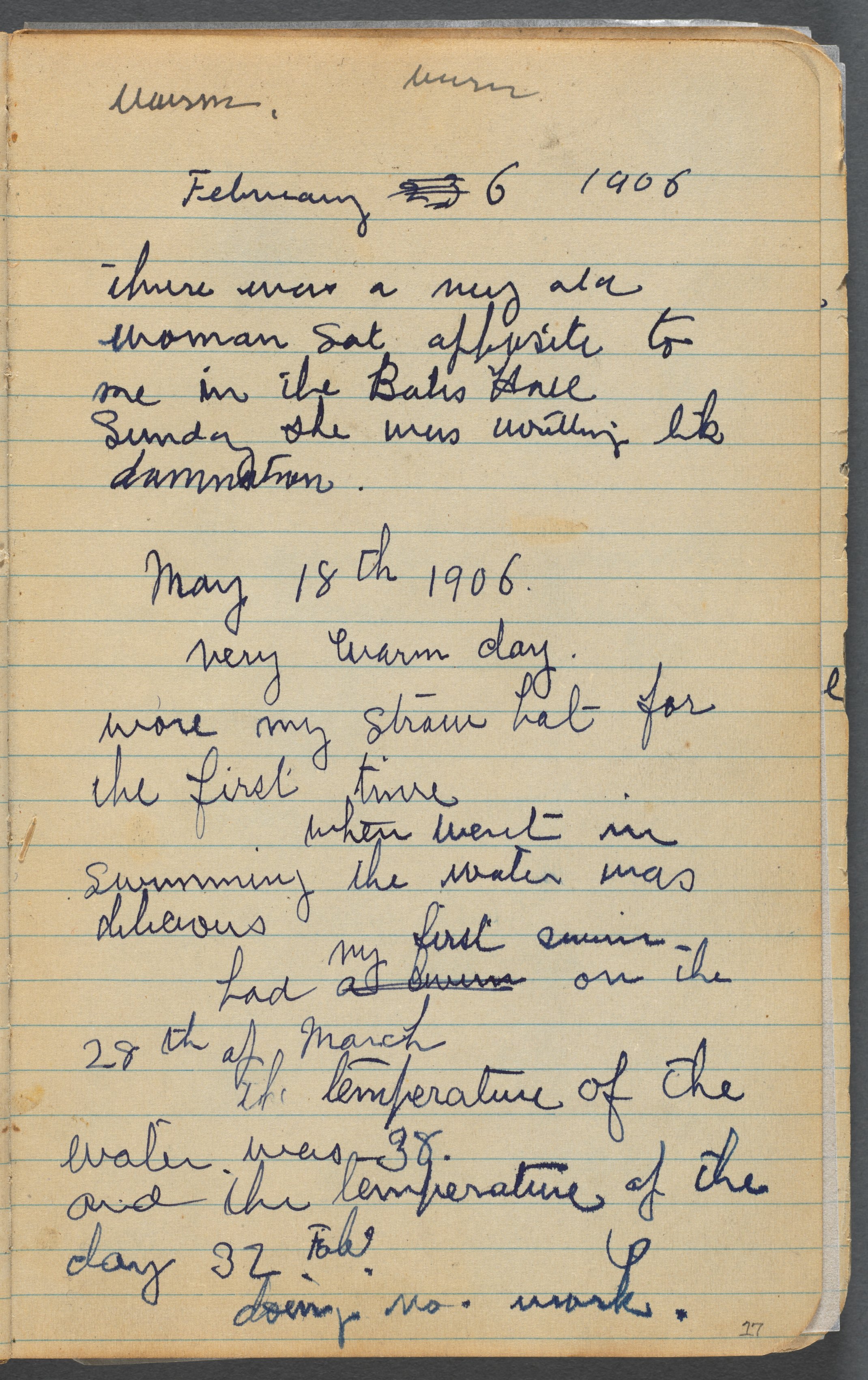 Yellowed lined paper with handwritten text in blue ink. The paper has a rounded corner on the top right. The text is written in cursive and includes dates, "February 6 1906" and "May 18th 1906". There are two paragraphs of writing. The first paragraph mentions "there was a nice old woman" and "the Baths". The second paragraph mentions "very warm day", "straw hat", "swimming", and "temperature". The background appears to be a dark surface. The image includes a small handwritten number "17" in the bottom right corner. The title "Sketchbook, page 017: Notes" and artist "by Maurice Prendergast" are associated with the image.