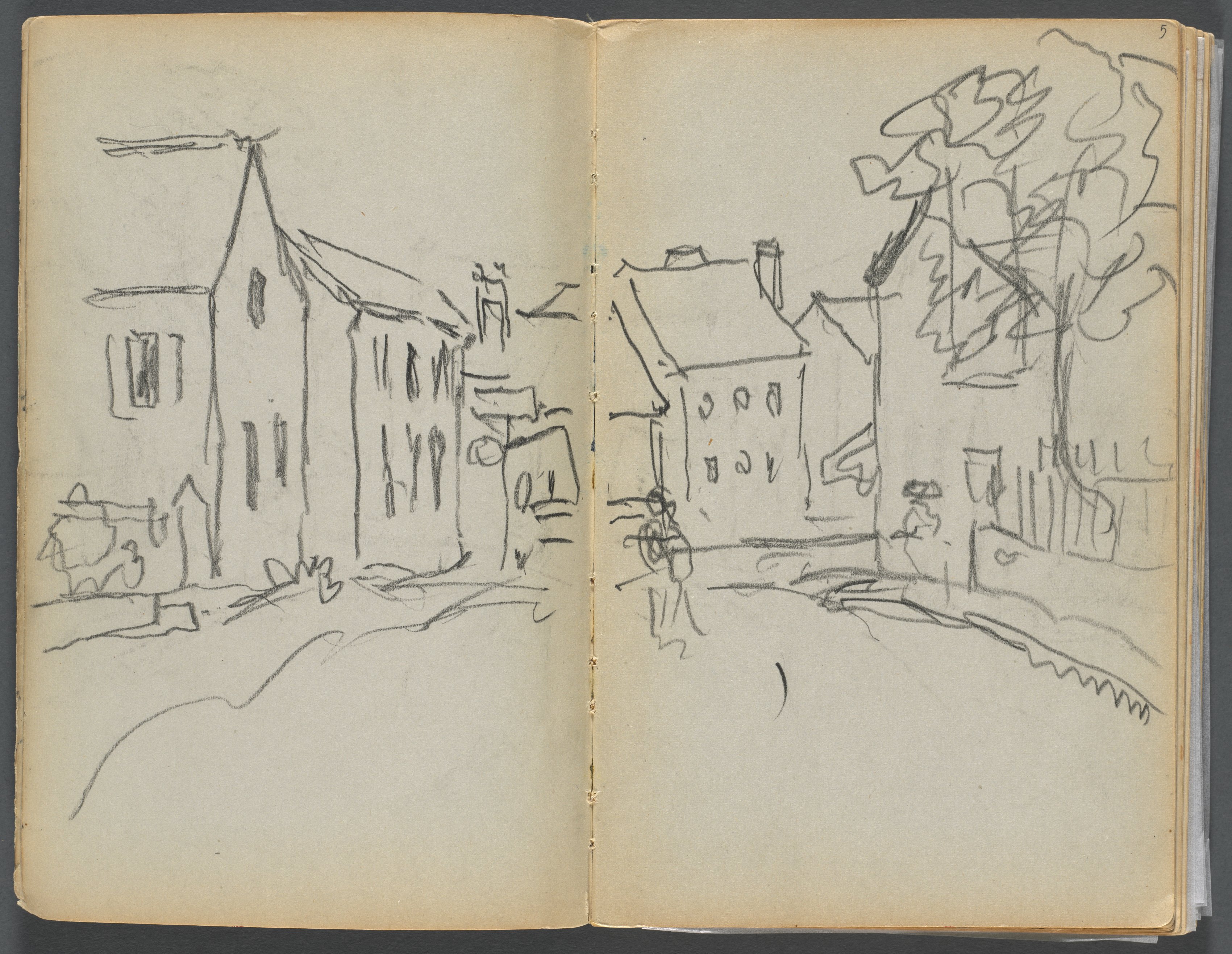 Two page spreads from a sketchbook, showing a street scene. The pages are yellowed, and the sketch on both pages is drawn in pencil. The left page depicts a large house with a steeply pitched roof and a smaller building beside it. A person or object sits on the left. The right page depicts a smaller house toward center with a large tree on the right; the tree's trunk is toward the right edge. Beyond the tree, the tops of fences are visible. A single line extends from bottom center to bottom right. The right edge of the right page is slightly curled. The sketchbook pages are open on a dark background.