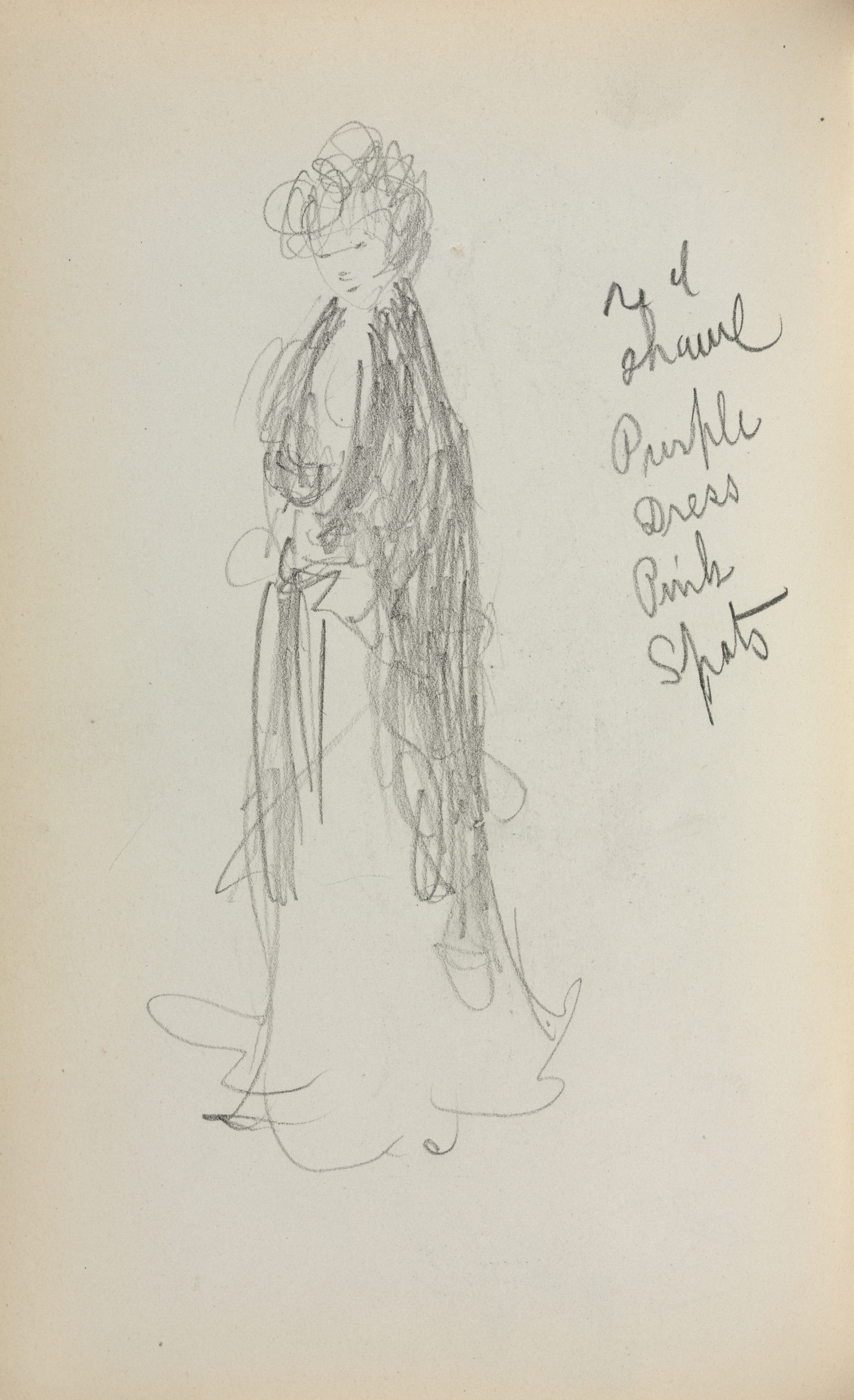 The image shows a pencil sketch of a standing woman. The woman is drawn in a loose, impressionistic style with dark hair pulled up on her head. She wears a long dress and a shawl draped over her shoulders. Her body faces right, and her face is drawn with minimal detail. The background of the sketch is a light beige color and resembles paper. On the right side of the image, handwritten notes are written in pencil and read: "y d shawl purple dress pink spots". The woman's dress appears to be purple, and her shawl has pink spots.