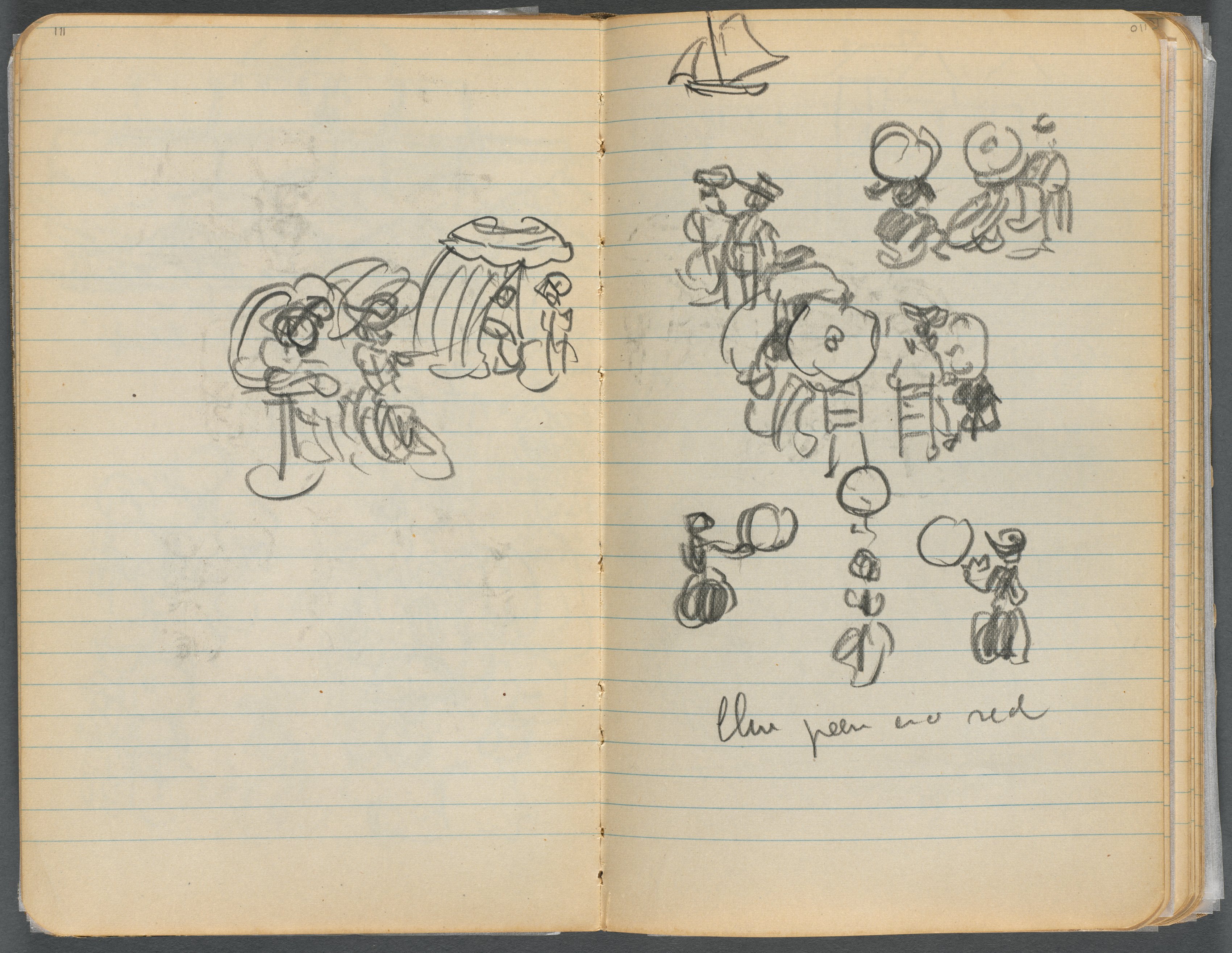 The image shows a yellowed, open notebook with lined paper. The notebook is open to pages 110 and 111. The pages have several pencil sketches of people on a beach. The left page has one main sketch of 2 people. The right page has several smaller sketches of people, including a few with their heads tilted back. One of the sketches on the right page shows a boat. The right page also has some illegible handwriting at the bottom. The notebook has a worn and aged appearance. The pages are slightly discolored and have some smudges. The notebook is set against a dark background.