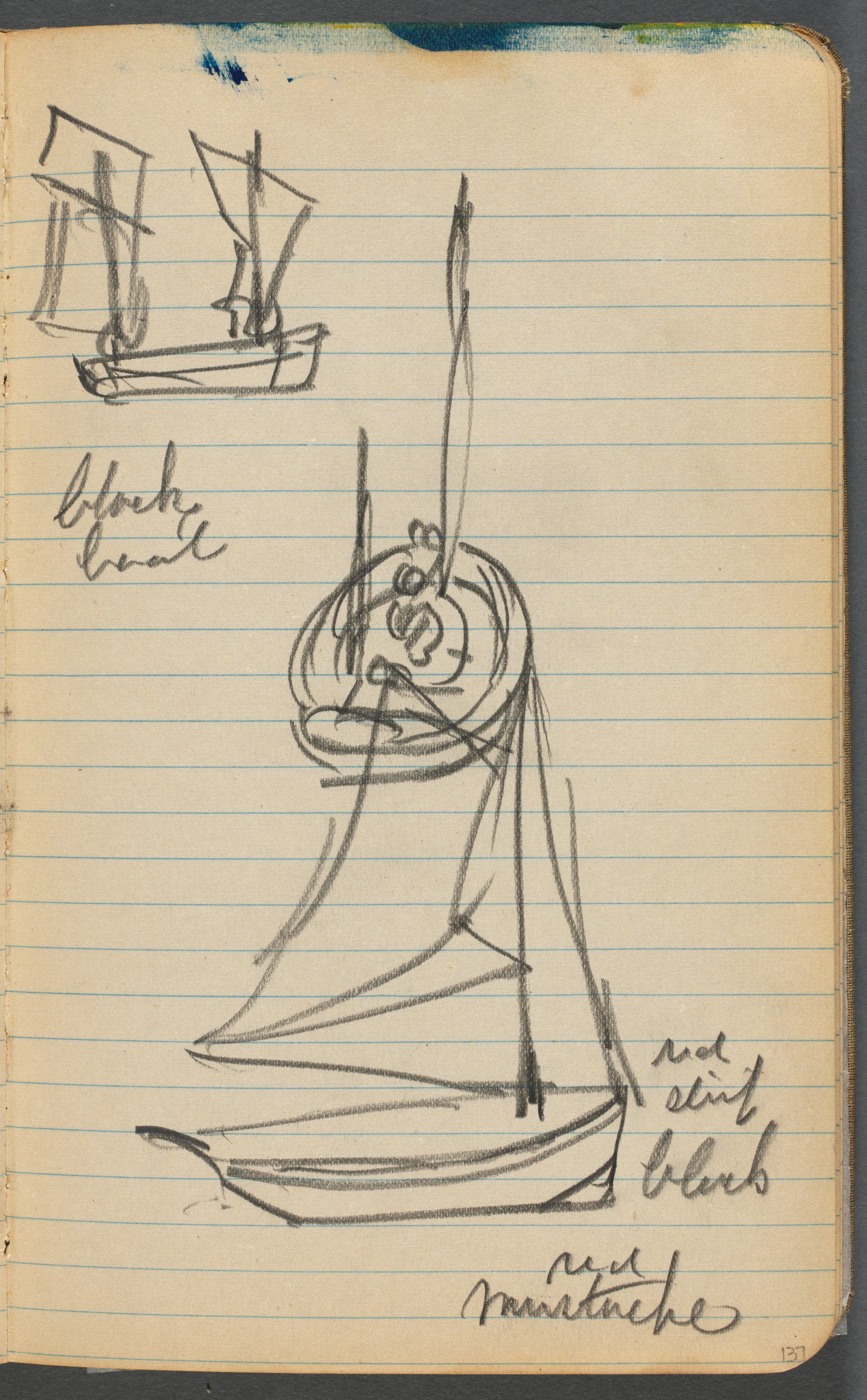 Lined paper with a yellowed background and blue lines. Two pencil sketches of sailboats are drawn on the paper. The larger sketch is in the center and bottom of the page. The boat has a curved hull and a tall mast with a rounded object near the top. There are notes written in cursive next to and under the drawing. The top-left corner has a smaller sketch of a boat with two masts. More cursive writing is to the left of this boat. The page is slightly worn and has a few stains.