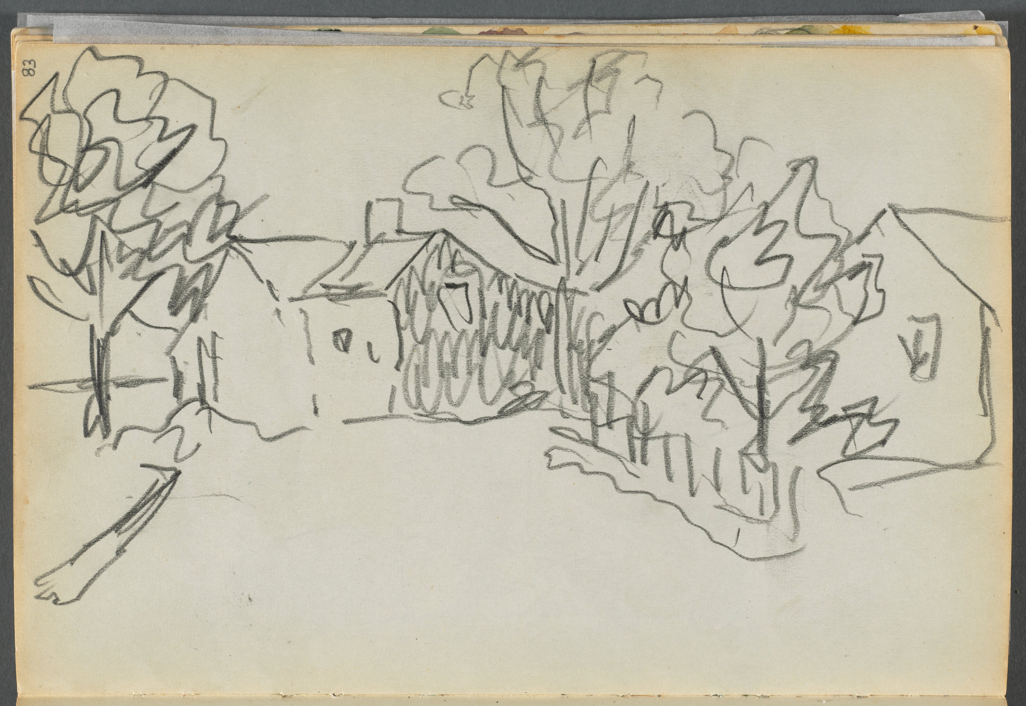 The image is a sketch of a village scene. The drawing is on aged paper with yellowed edges. A simple line drawing depicts a scene with buildings and trees. The buildings are drawn with simple lines and shapes, with one central building with a peaked roof. Two trees are on the left and right sides. The trees are drawn with loose, expressive lines. The background of the drawing is minimal, with no details. The overall effect is one of simplicity and elegance.