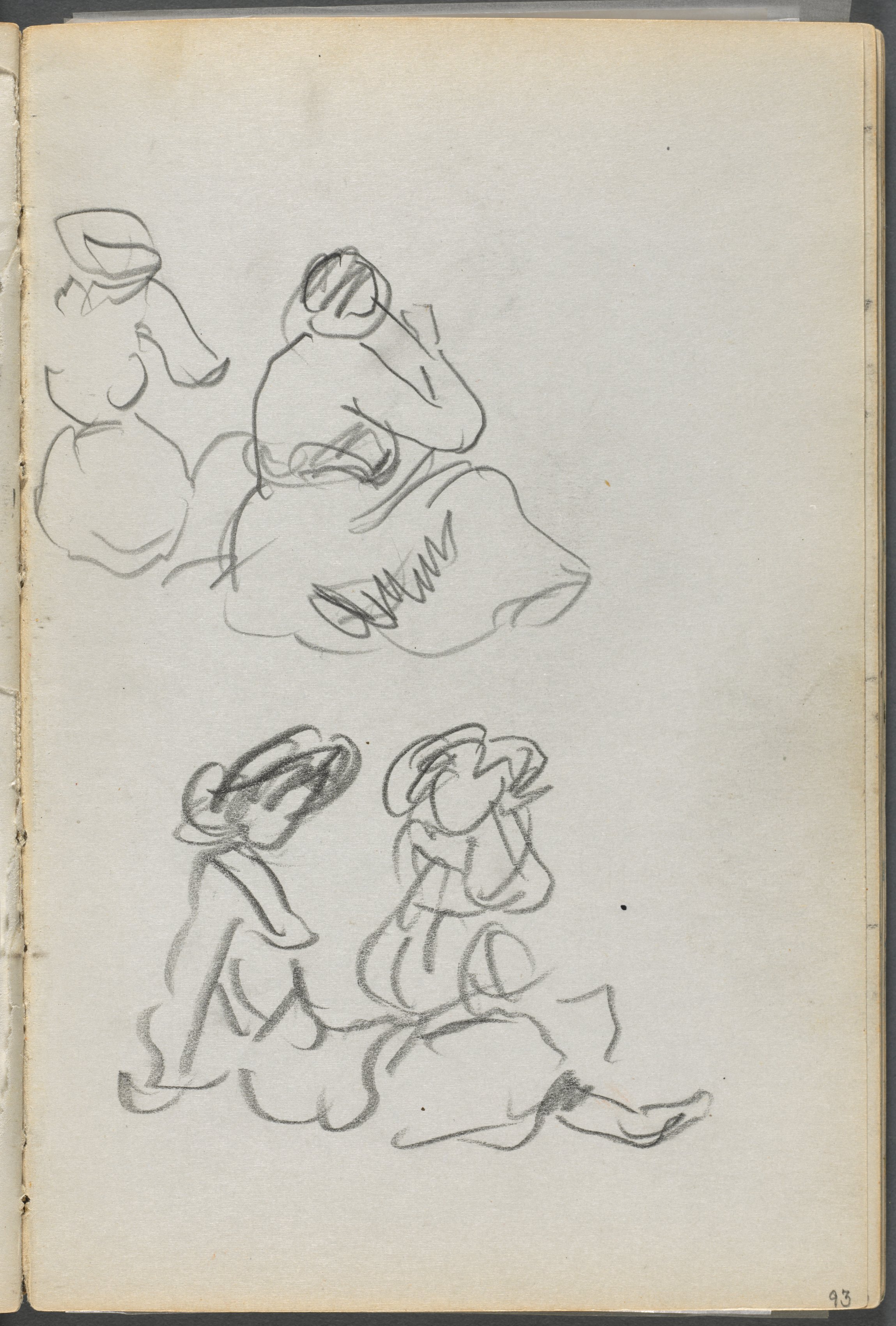 A pencil sketch on aged paper of four seated figures. The paper is off-white with yellowed edges. The top half contains two sketches of a figure sitting with their back to the viewer; one in the top left corner with their head turned to the right and wearing a hat; another on the top center with their head turned to the left. The bottom half contains two sketches side by side of a figure sitting with their head looking to their right; the figure on the bottom right with their right leg extended. The sketches are simple line drawings with minimal shading. The page is numbered 93 in the bottom right corner.
