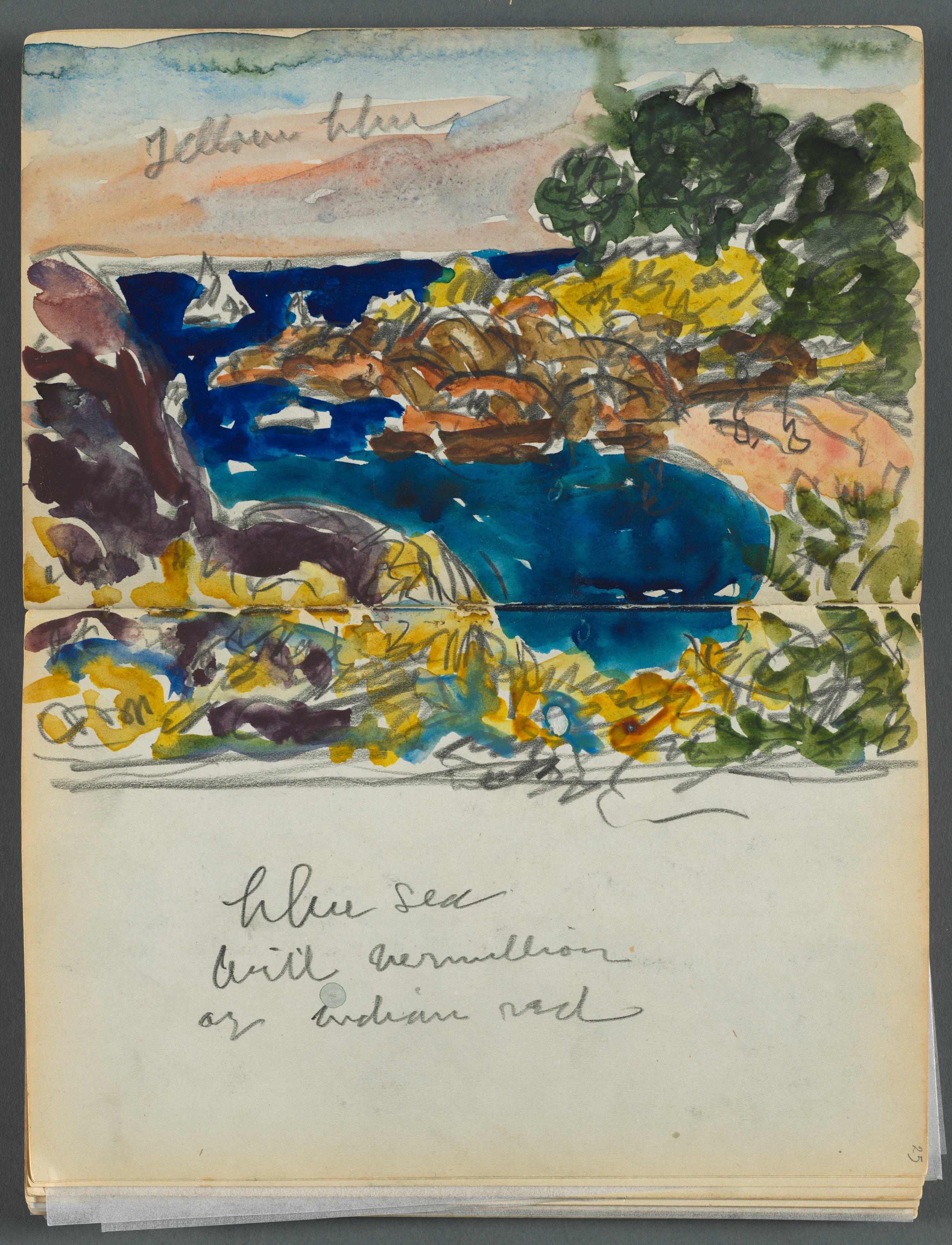 Watercolor painting of a harbor view. The painting shows a body of water surrounded by land and foliage. The sky above has hues of blue, peach and orange. The water in the harbor is dark blue. The land on the right is covered with green foliage. The left side shows brown and yellow foliage. There are handwritten color notes on the top and bottom. The top note says, "yellow ochre." The bottom note reads, "blue sea with vermillion or Indian red." The pages appear to be from a sketchbook. The sketchbook pages are off-white and yellowed. The stack of pages are visible at the bottom.