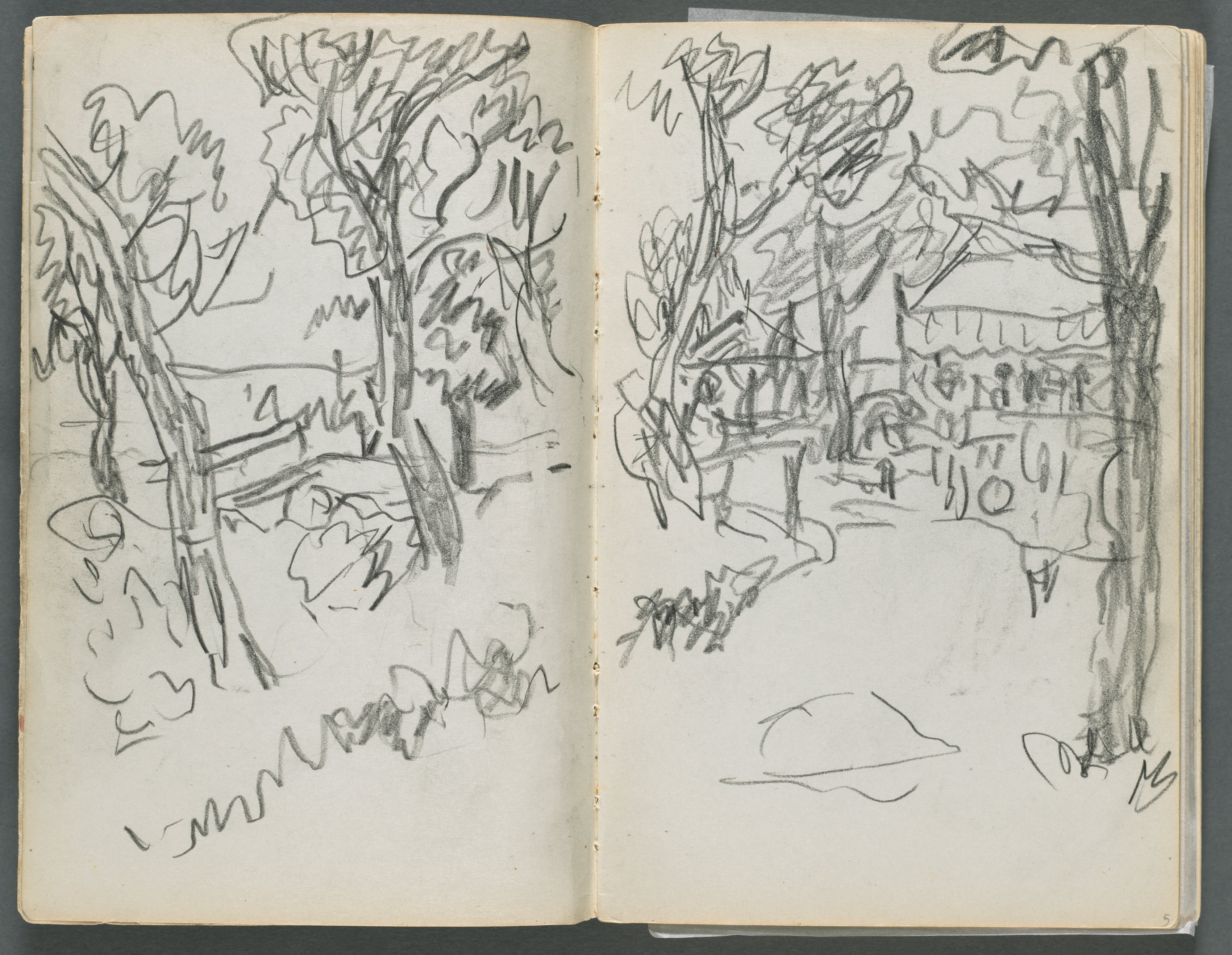 Open book with two pages side by side. Pages are filled with pencil drawings of trees, bushes, and a building in the background. Drawings are sketchy and impressionistic. Left page shows a tree on the left and what appears to be a bench and more trees in the background. Right page shows a building through trees. A signature appears in the bottom right corner. Pages are off-white and yellowed.