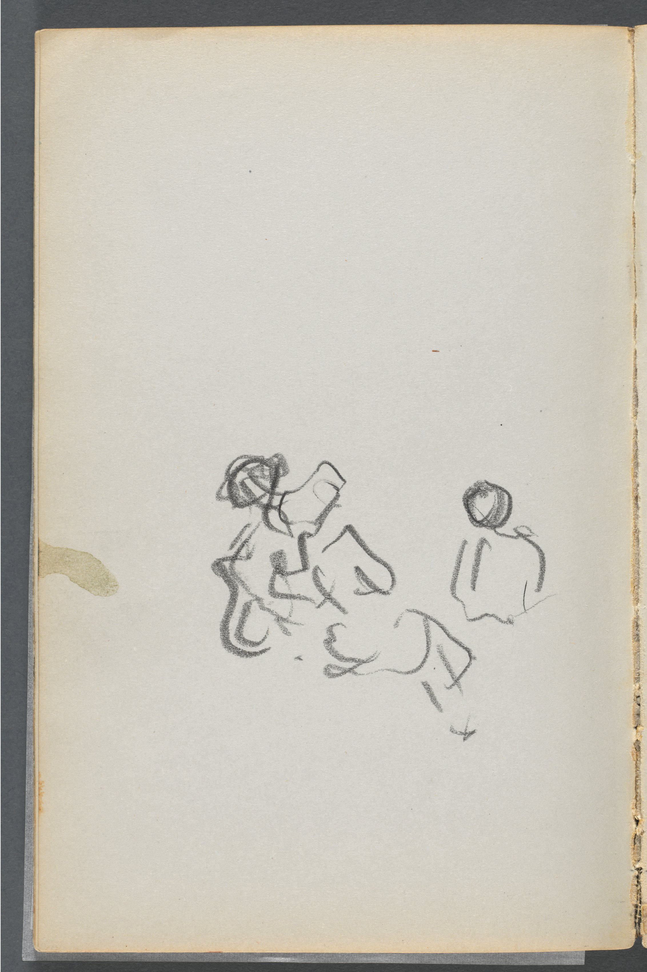A sketch of two figures on an off-white piece of paper. The paper is rectangular and has a yellowed appearance with a darker border around the edges. A small, irregular light-brown stain on the left side. Two simple sketches of people drawn in pencil; one sitting on the left, with their head tilted down and to the right and their right leg bent; the other on the right, with no facial features, wearing what appears to be a shirt. Both figures are drawn with minimal detail.