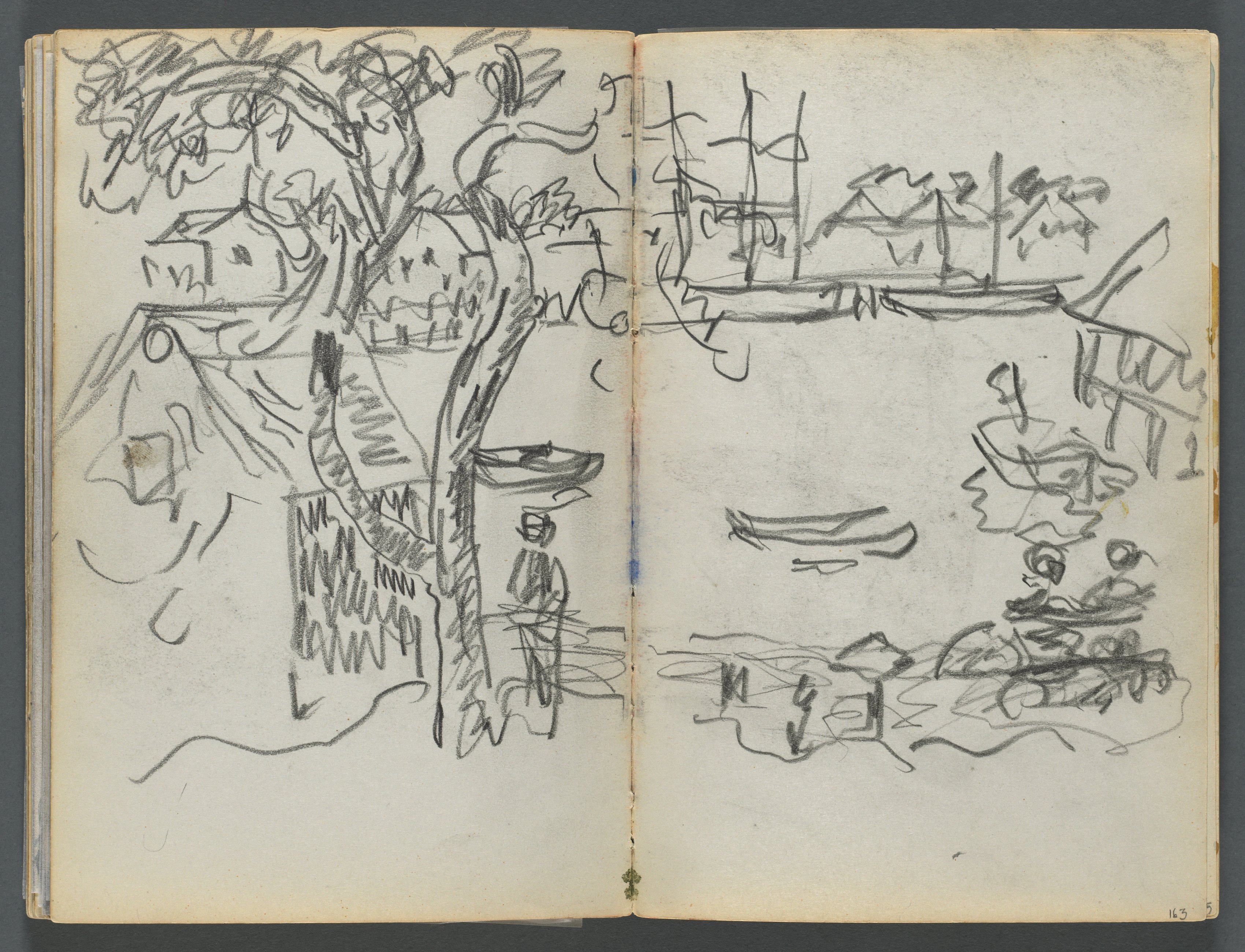 Open book with two facing pages featuring a black and white sketch. The left page shows a tree and house on the left side with a figure standing near a boat on the right side. The right page depicts a landscape with a body of water with boats in it and a distant shoreline with buildings. The sketches are simple, impressionistic line drawings with minimal details. The pages are yellowed with age and have some darker marks and discoloration. The book's cover is not visible. The image background behind the book is dark gray.