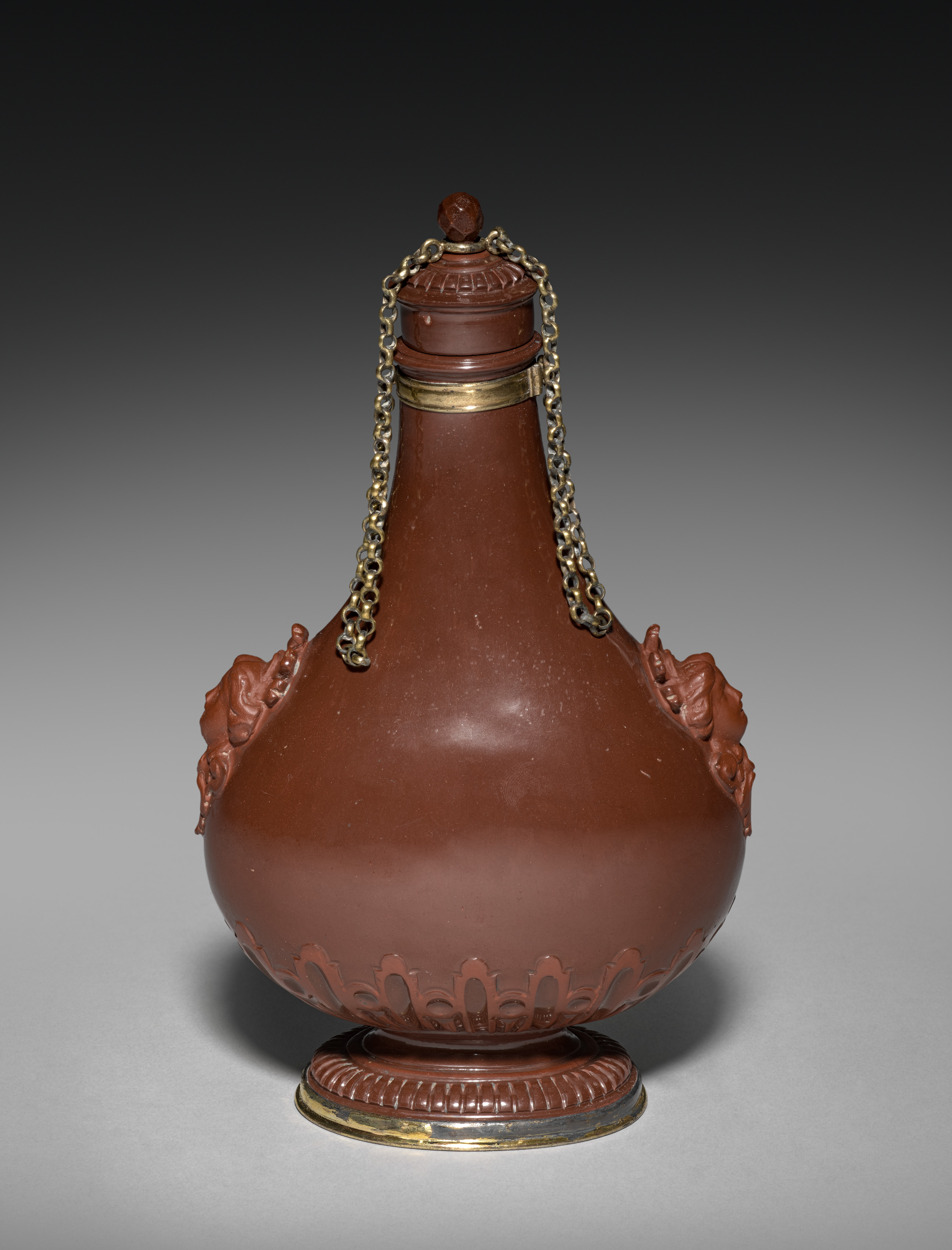 Brown ceramic bottle with a narrow neck and a bulbous body. The bottle has a small knob on top and a chain attached to either side. The base and top have metal bands around them. The base is also metal. There are raised designs on the sides. The background is gray and dark at the top and lighter at the bottom. The object is referred to as a Pilgrim Bottle by Meissen Porcelain Factory.
