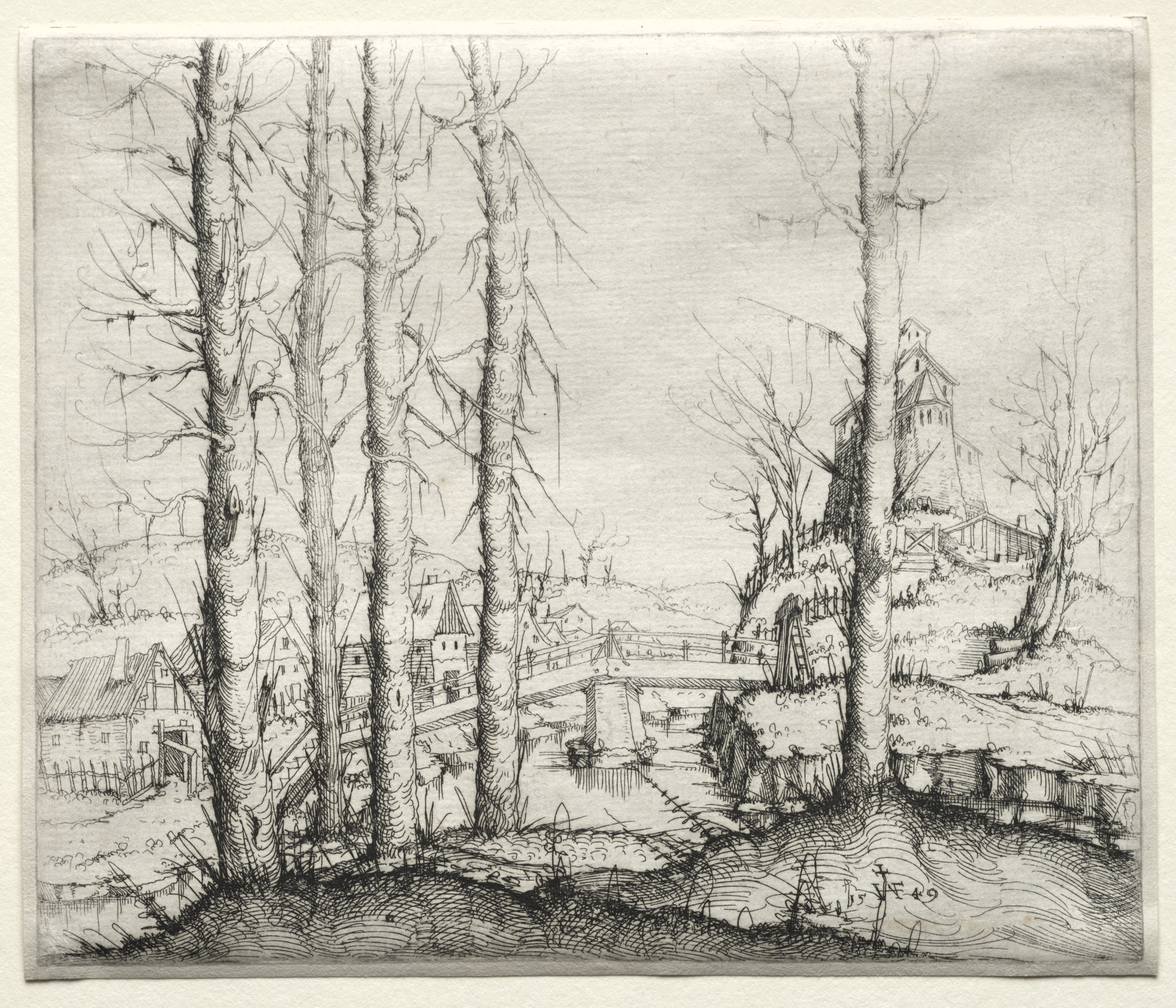 Black and white drawing of a landscape. Bare trees in the foreground. A bridge crosses over a river in the midground. A fence borders a house on the left. A tall building with a pitched roof on the right. The trees have no leaves and have thin, straight trunks. The sky is shaded with darker areas. A body of water runs through the center. Several buildings are in the background.
