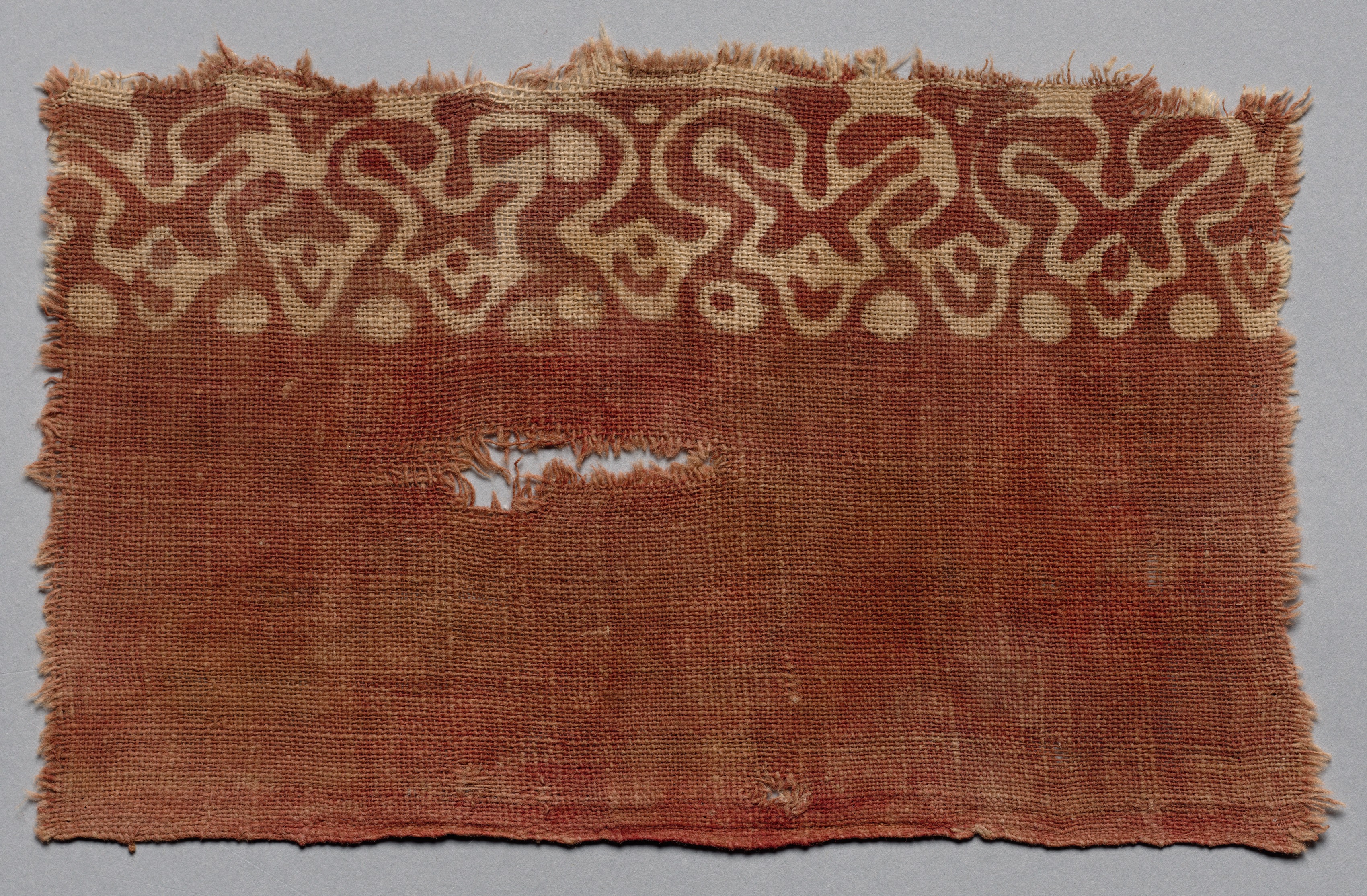 Reddish-brown rectangular piece of fabric with frayed edges, featuring a decorative tan-colored pattern along the top edge; the pattern consists of interconnected loops and swirls; a small hole is present in the center of the fabric; the background of the image is gray. Fragment by artist.