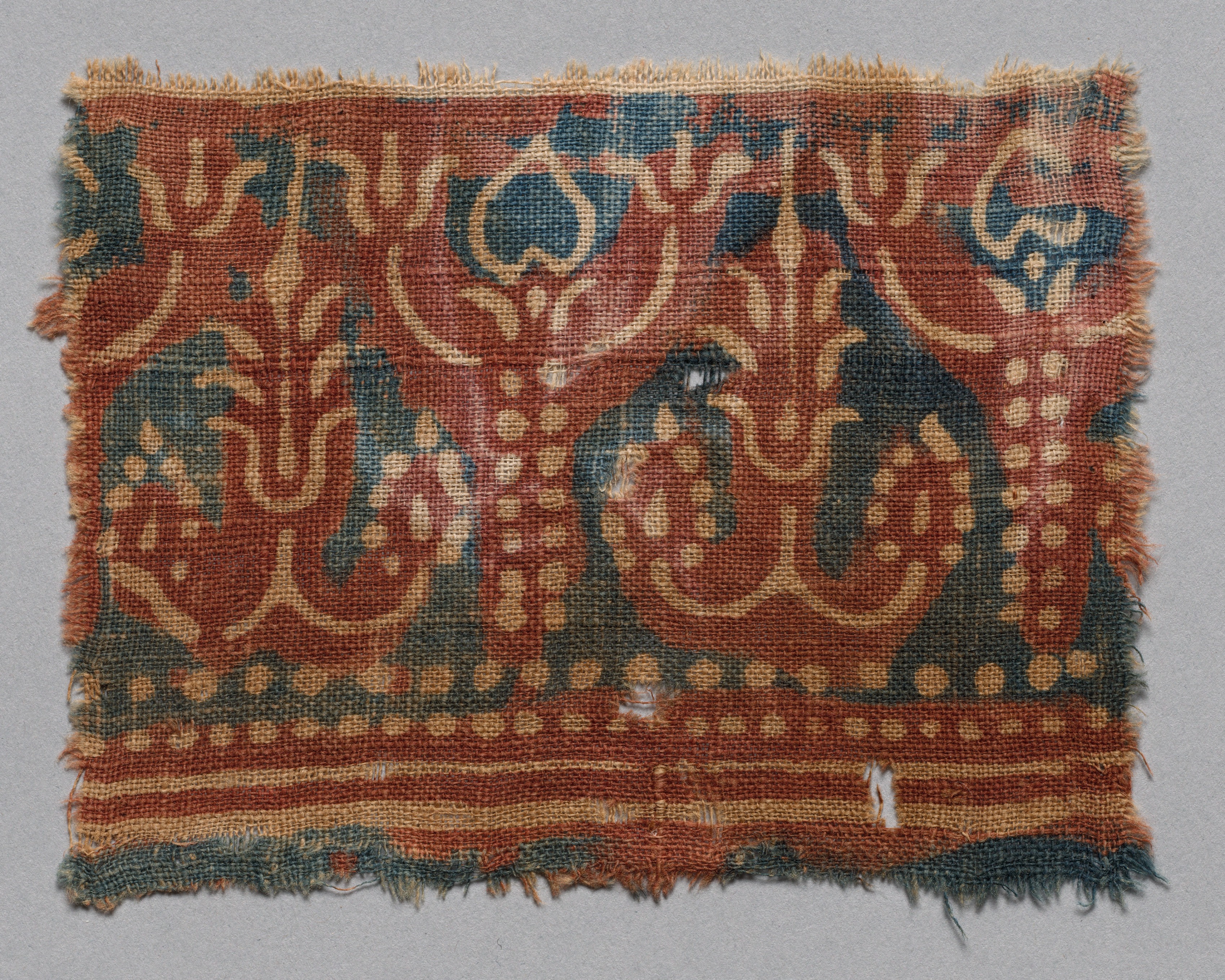 Reddish-brown fabric with frayed edges, featuring a repeating pattern of blue and yellow designs. The design consists of teardrop-shaped motifs with curved tails, resembling a fleur-de-lis. The motifs are arranged in a symmetrical composition, with a row of small yellow dots along the bottom. A horizontal band of yellow and red stripes is at the bottom, with a blue background. The fabric, titled "Fragment" by an unknown artist, appears to be a textile fragment, possibly from an ancient or historical piece, given its worn and frayed condition.