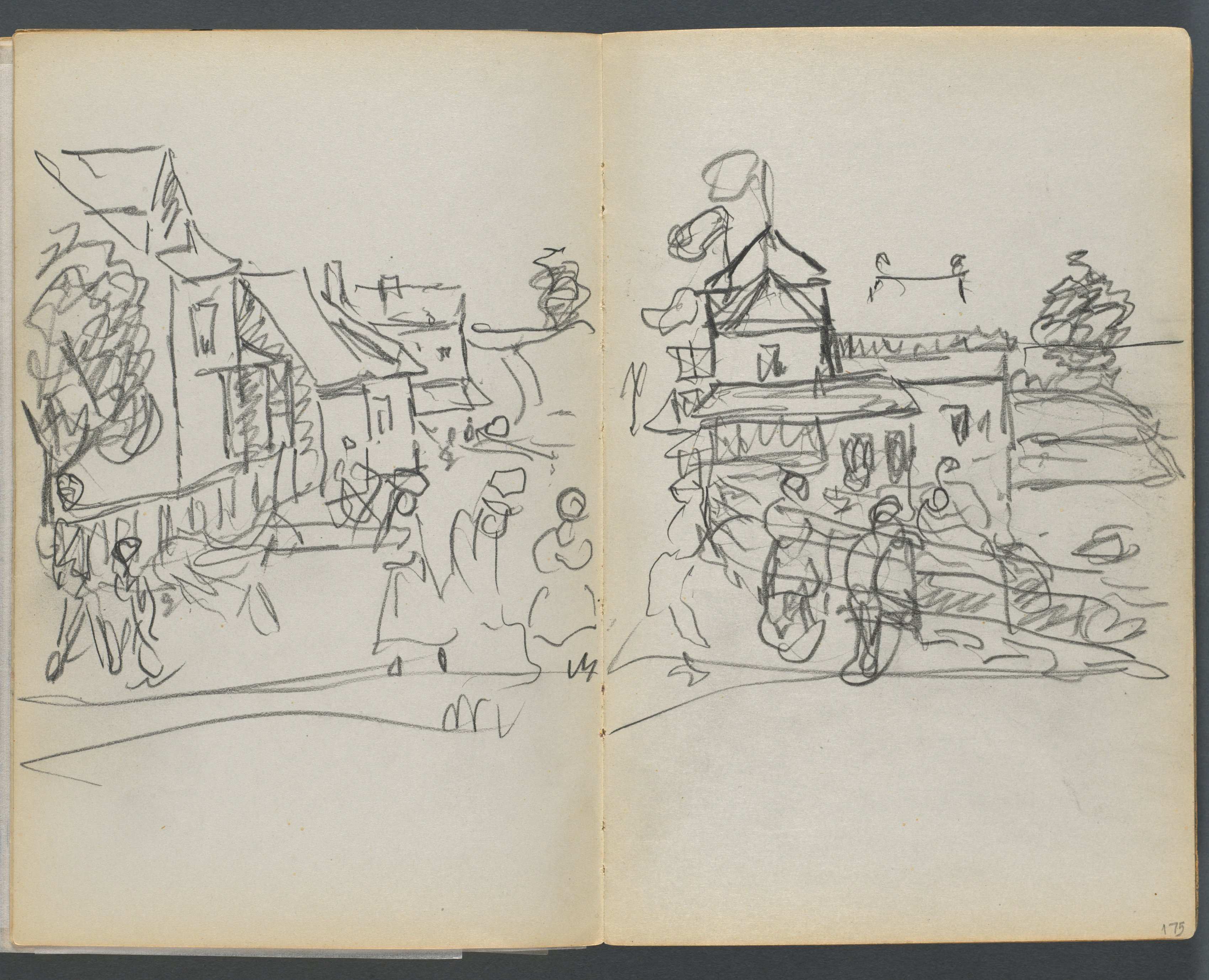 The image shows two sketchbook pages, side by side, with pencil drawings. The pages are yellowed with age and have a rough texture. The left page has a sketch of a village scene with houses and a road. There are several buildings, some with steeply pitched roofs and chimneys. A tree is visible on the left side of the page. People are standing in front of the buildings. The right page has a similar village scene with houses and a road. There are several buildings, some with steeply pitched roofs and chimneys. A tree is visible on the right side of the page. A person on a bicycle is in the foreground. The drawings are loose and expressive, with bold lines and minimal details. The overall effect is one of quick, impressionistic sketches.