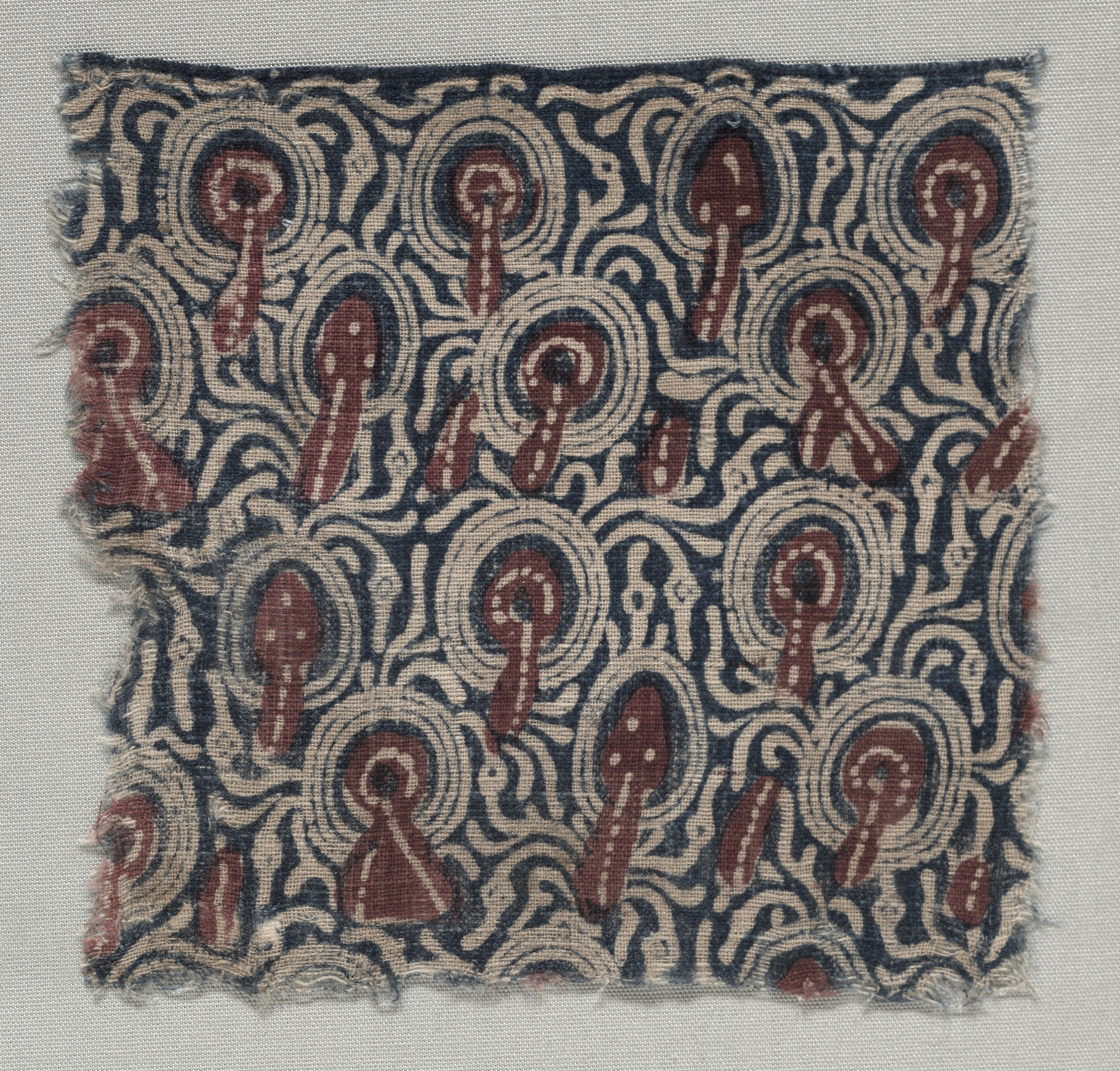 Fragment by artist. A square piece of fabric with a frayed edge, featuring a repeating pattern of red and white shapes on a dark blue background. The pattern consists of rounded figures with white spots and curved lines. The figures are surrounded by white circles and wavy lines. The fabric has a rough texture and appears to be made of a woven material. The background behind the fabric is light gray.