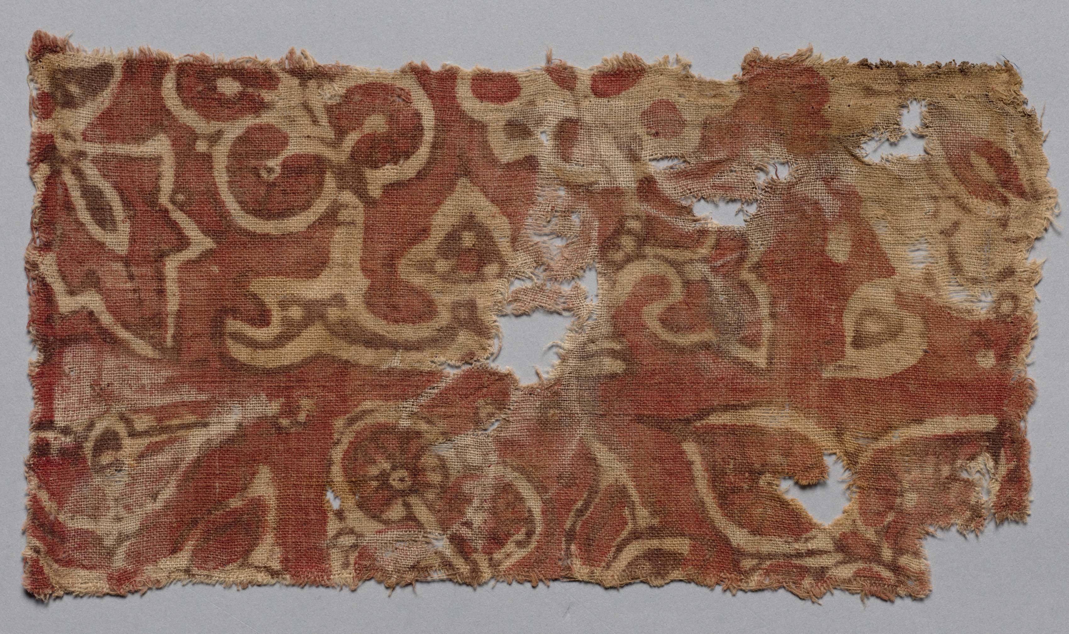 Red and beige fabric with a repeating design. The fabric is rectangular and has frayed edges. The design features beige swirls and teardrop shapes on a red background. There are several holes and tears in the fabric, particularly in the center and on the right side. The fabric appears to be old and worn, with a rough texture. The background behind the fabric is light gray. Title: Fragment. Artist: Unknown.