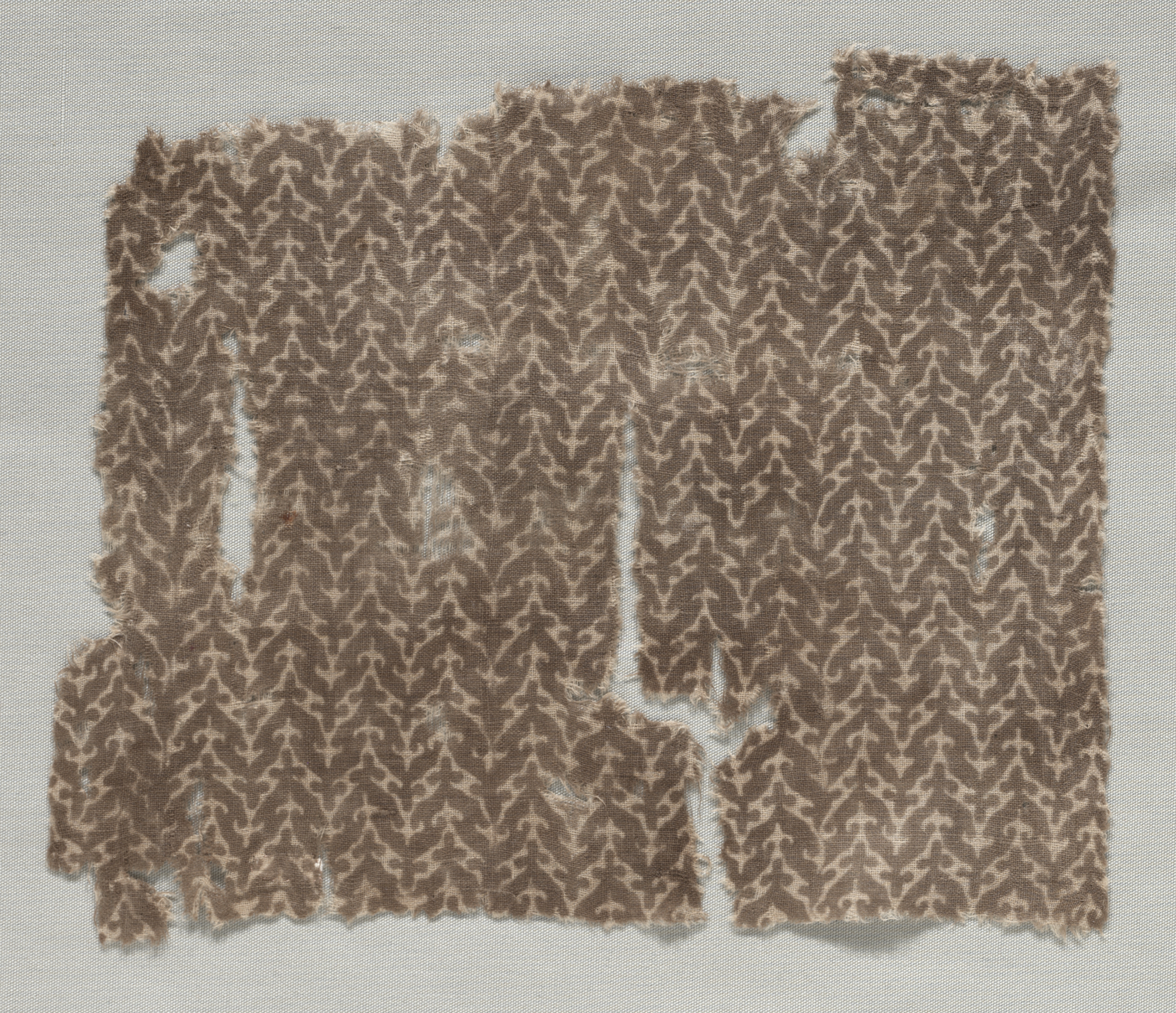 Brown and light brown knitted fabric fragment with a repeating pattern, frayed edges, and several tears; on a light gray background; titled "Fragment" by an unidentified artist.
