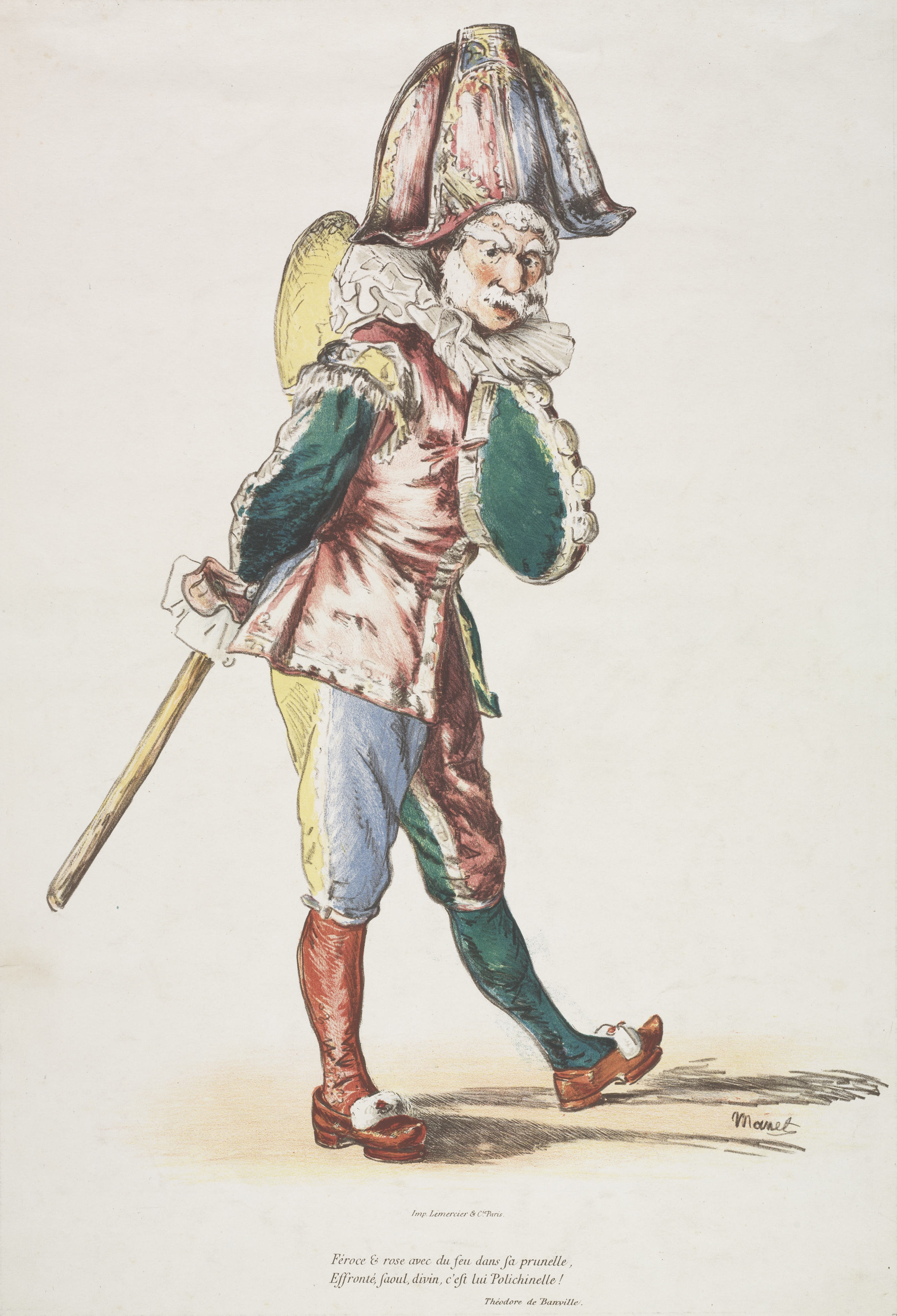 The image shows a colorful illustration of a man dressed in a historical or theatrical costume. The man is depicted walking to the right. He wears a large, tall hat that is striped and has a wide brim; a pink and green jacket with white fur trim; blue and green pants; brown boots; and brown shoes. He holds a long wooden stick in his right hand. The background is a plain off-white color. The artist's signature is visible in the bottom-right corner.