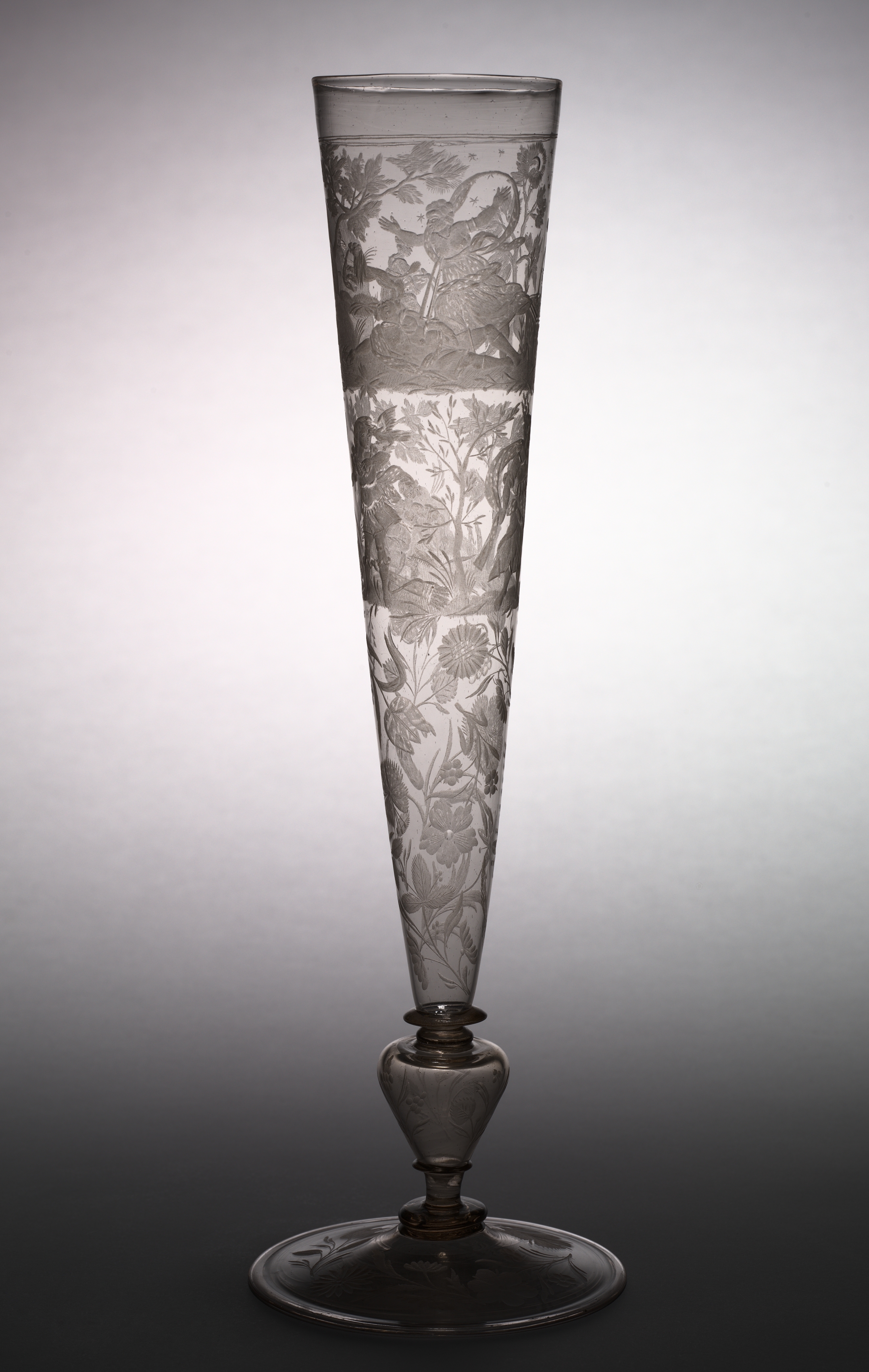The Flute Glass by an unknown artist features a tall, clear glass object with a wide mouth and a narrow base. The glass object tapers from the top and bottom towards the middle. The top section showcases an etched design depicting people and foliage. The middle section features an etched floral pattern. The base of the glass object has a bulbous shape that tapers down to a circular base. The glass object stands on a plain background that transitions from dark at the bottom to light at the top.