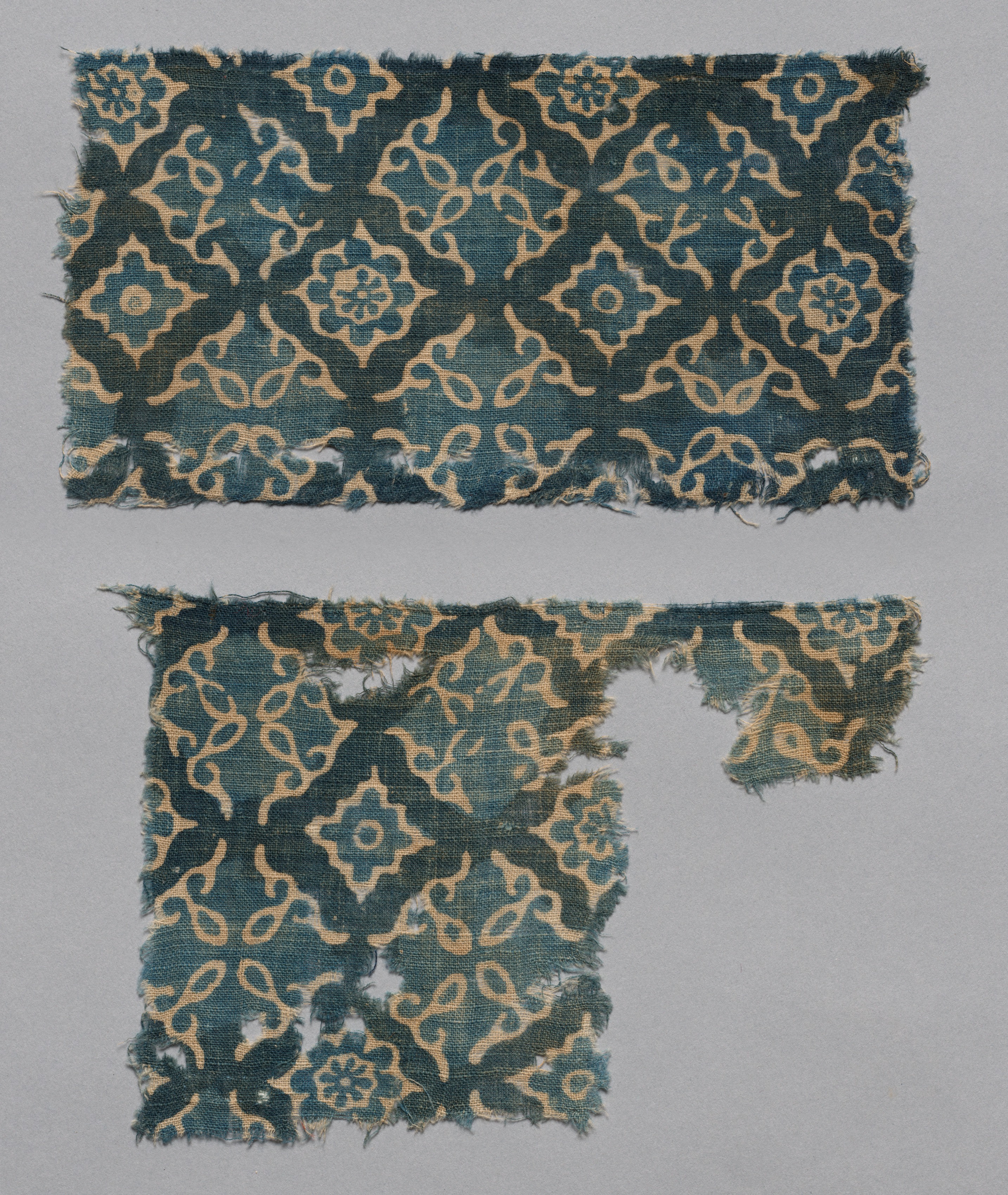 The image shows two fragments of a blue and gold patterned fabric. The fabric is rectangular and has a frayed edge. The top fragment is larger and longer than the bottom one. The bottom fragment is smaller and has a jagged edge on the right side. The background of the image is light gray. The pattern on the fabric consists of a repeating design of interlocking gold lines and shapes on a blue background. The shapes are symmetrical and have a floral or geometric design. The gold lines are curved and twisted. The blue background is a deep teal color. The fabric appears to be old and worn. It is titled "Fragments" by an artist.