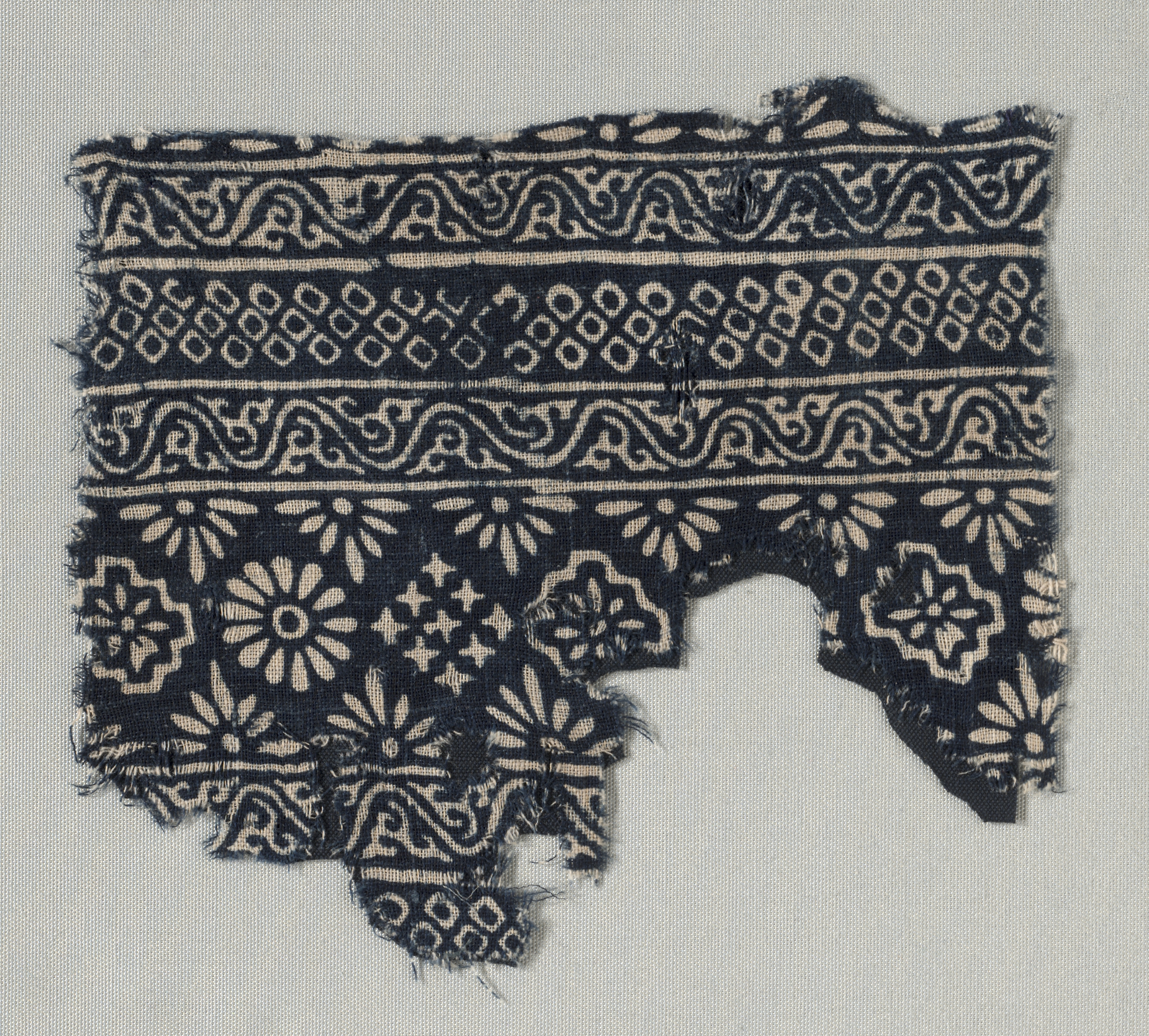 Black and tan fabric with a repeating design. The fabric is predominantly black with tan designs throughout. Horizontal bands contain a variety of patterns, including diamonds, curved lines, and flowers. The top and bottom edges are frayed. A semi-circular section is missing from the bottom. The background behind the fabric is light gray. Fragment with decorated bands by Unknown.