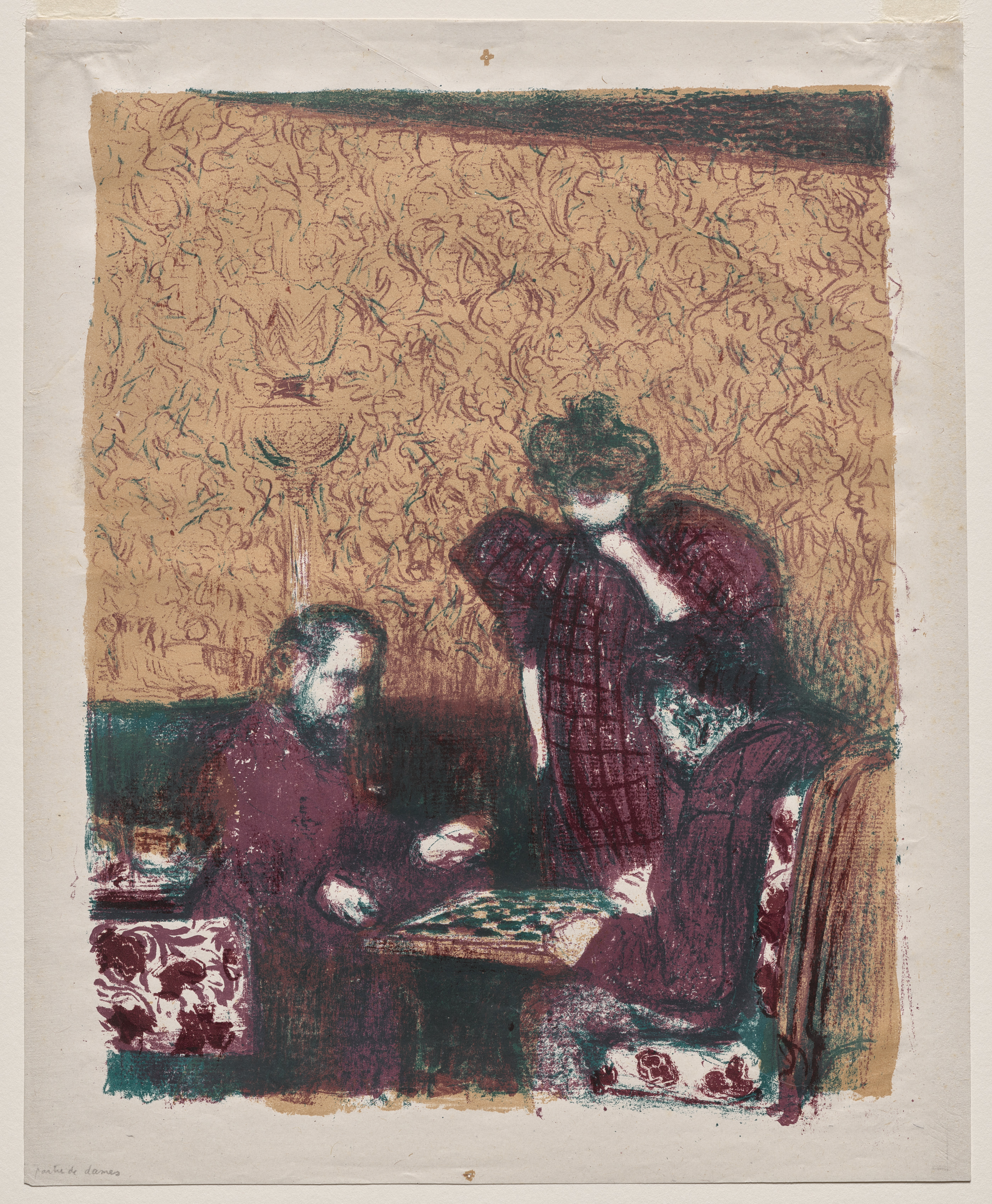 The Game of Checkers by Edouard Vuillard. A man and a woman are indoors. The man sits on a couch to the left. The couch has a green back and arms and a maroon and white floral patterned seat and back cushion. The man wears a maroon shirt and has both hands on a checkerboard resting on a small table in front of him. The woman stands on the right. She wears a maroon dress with short puffy sleeves and a high neckline. The woman's left hand is on her chest. The woman's right arm hangs down at her side. The background is a tan wallpapered wall with a floral pattern in maroon and green. The wall has a dark brown horizontal stripe along the top. The edges of the paper are off-white. The image is slightly blurry and impressionistic.