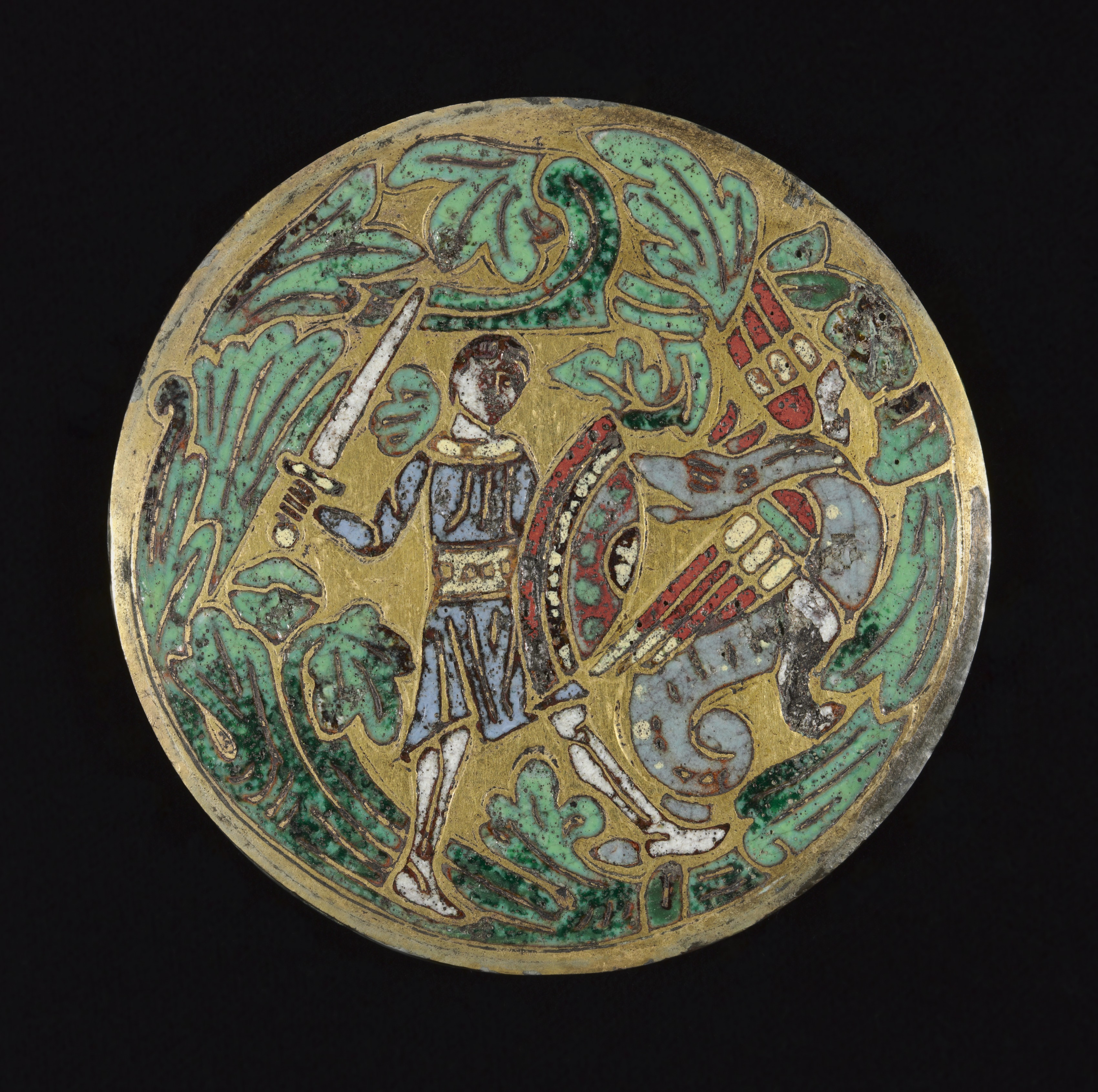 Round gold-colored metal object with a design. A man wearing a blue tunic and white boots holds a sword in his right hand. He faces a dragon-like creature with a red and gray body, and a red and white head. The man and dragon are surrounded by green foliage. The background is black. Title: Warrior Fighting a Dragon. Artist: Unknown.