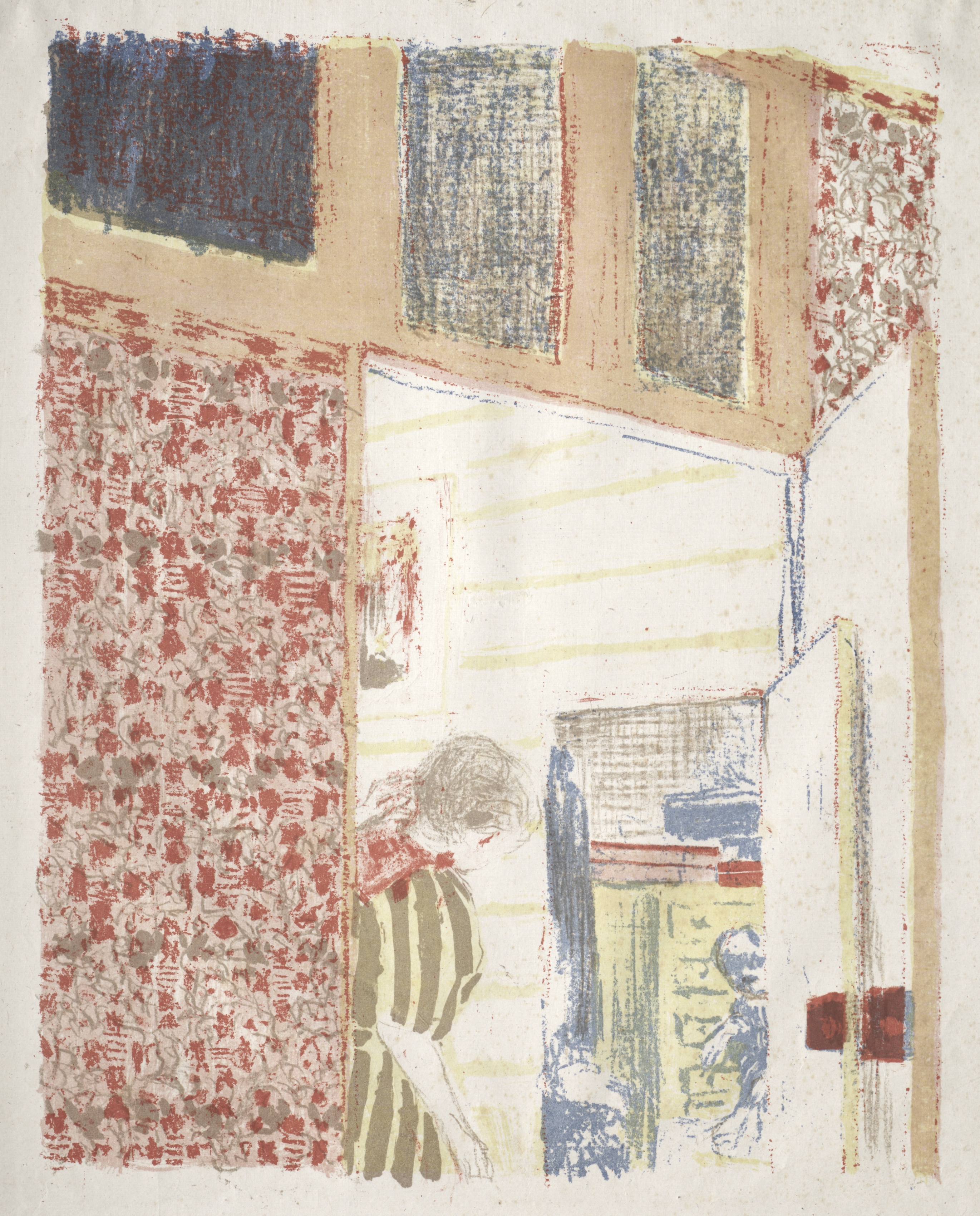The image depicts a room interior with a woman. The room's left wall features pink wallpaper with a floral pattern. The right wall is white with horizontal lines. The floor is not visible. The woman is standing in the lower center, wearing a green and white striped dress. Her head is bowed and her hair is short and brown. Above her, two windows are visible on the back wall. The window on the right is open, with its white shutter folded back. The windows have blue panes. The image's color palette includes pink, green, white, blue, and brown. The painting style appears to be impressionist. The artist's use of color and pattern creates a sense of domesticity. The composition focuses on light and texture. The overall mood is quiet and introspective. The image is titled "Interior with Pink Wallpaper III" by Edouard Vuillard.