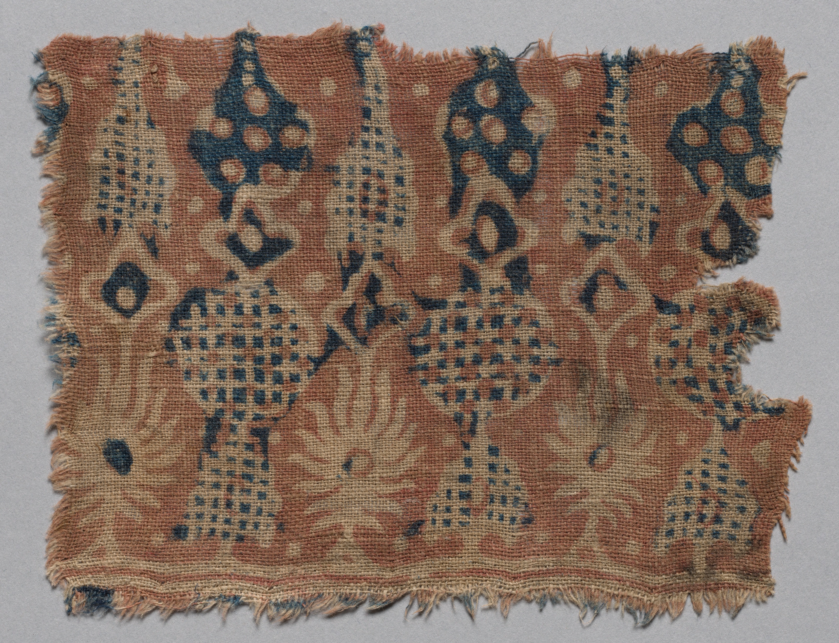 Brown and blue patterned textile fragment with frayed edges; visible blue and light-brown designs resembling trees or plants; blue spots; light-brown background; frayed edges; Fragment by the Met.