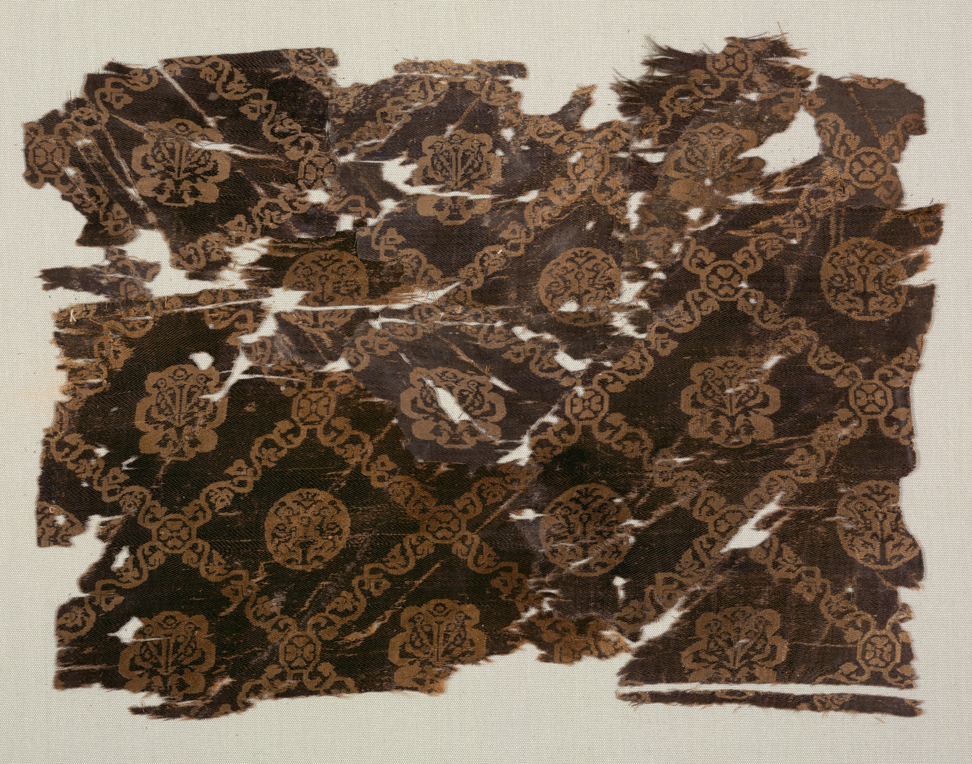 Brown silk fabric with lattice pattern. The lattice divides the fabric into diamond-shaped sections. In each section is a medallion with symmetrical curved line pattern. The background of the lattice and medallions is brown with the lattice and medallions a lighter brown. The fabric is torn and frayed around the edges. The fabric is mounted on a beige background.