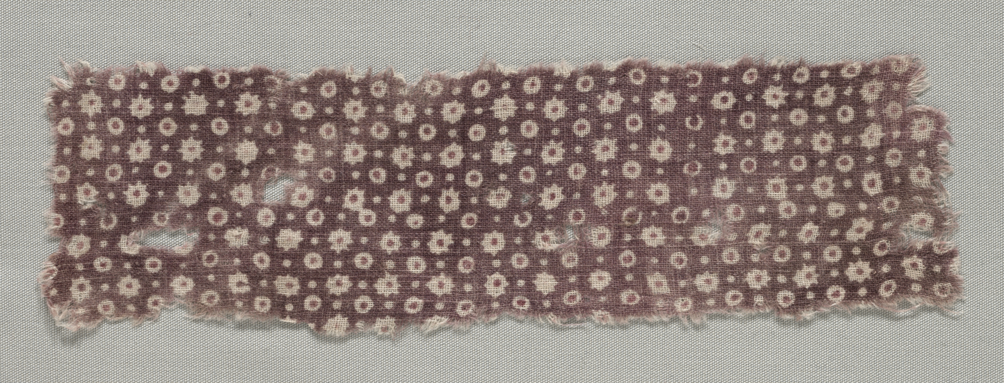 The artwork, titled "Fragment" by an unspecified artist, depicts a rectangular piece of fabric. The fabric is brown with a repeating pattern of small, light-colored circles and flowers. The fabric's edges are frayed and rough. The background of the image is a light gray color.
