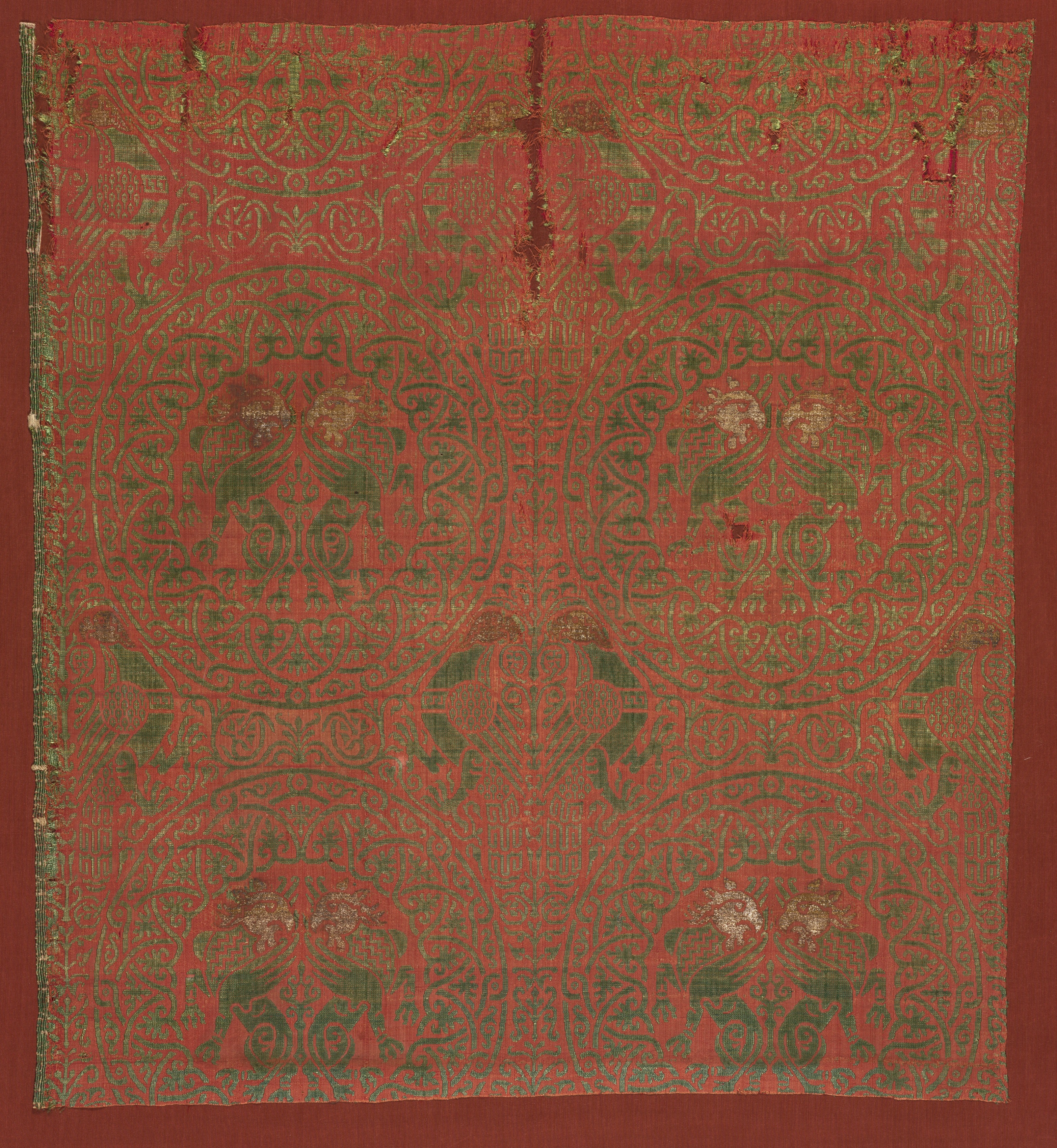 Red fabric with green and gold designs. The fabric is square-shaped with a visible seam down the middle. The fabric has a red background with intricate green and gold patterns. The patterns include floral motifs and geometric shapes. There are four large circular designs, two on the top half and two on the bottom half. The fabric has a worn and frayed edges, with some areas of damage and discoloration. The fabric is set against a dark red background. The artist and title of the piece is "Silk Fragments".