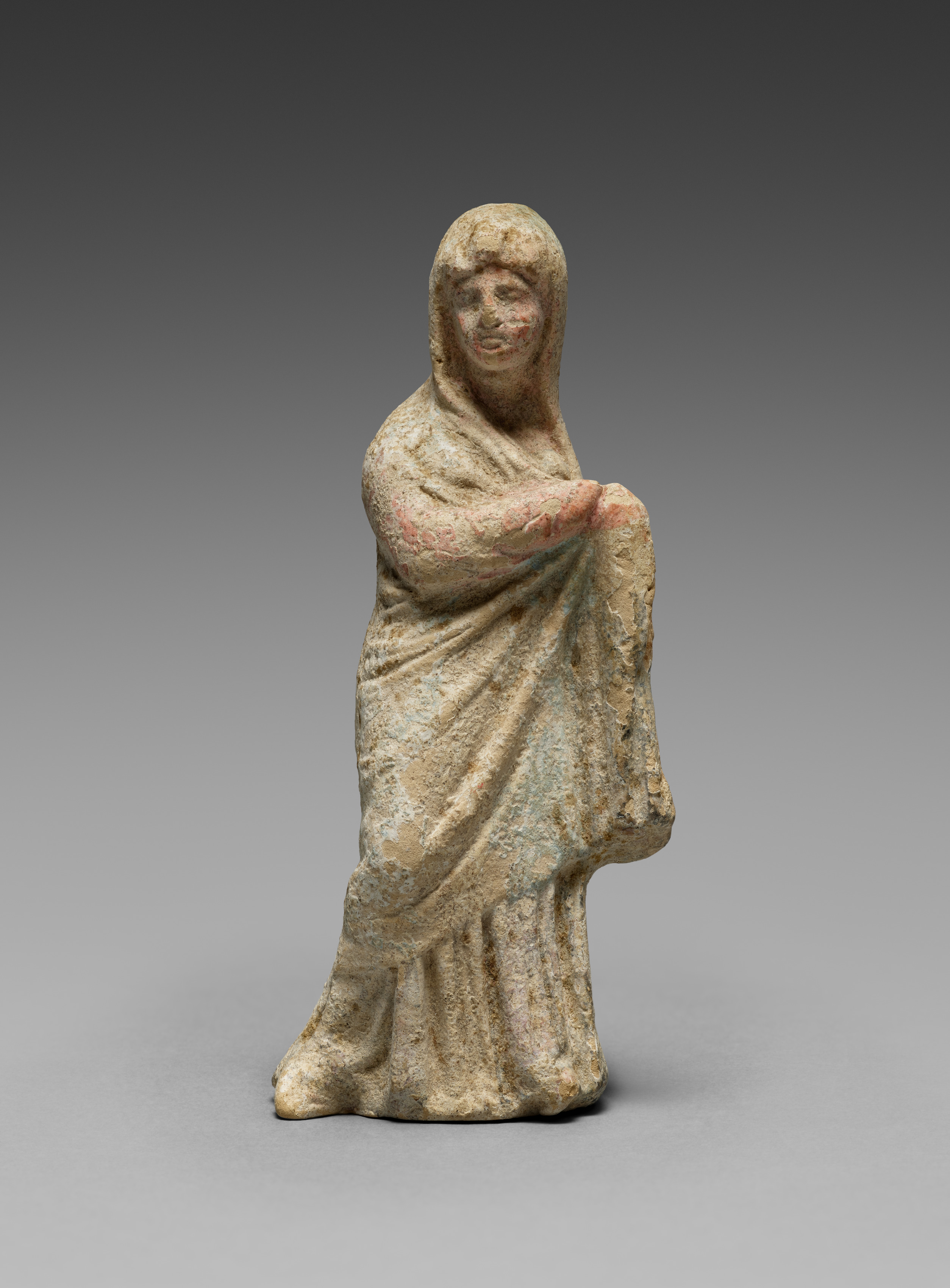 Small figurine, possibly ancient, of a woman with a neutral expression. The figurine is made of a light-colored stone or ceramic material. The woman's body is draped in a long robe or dress with folds visible. Her head is covered by a hood or veil that falls down her back. Her arms are bent at the elbows and positioned in front of her. The figurine stands on a flat base. The background of the image is a gradient from dark gray at the top to light gray at the bottom. The overall appearance of the figurine suggests it could be an archaeological artifact. Figurine by artist unknown.
