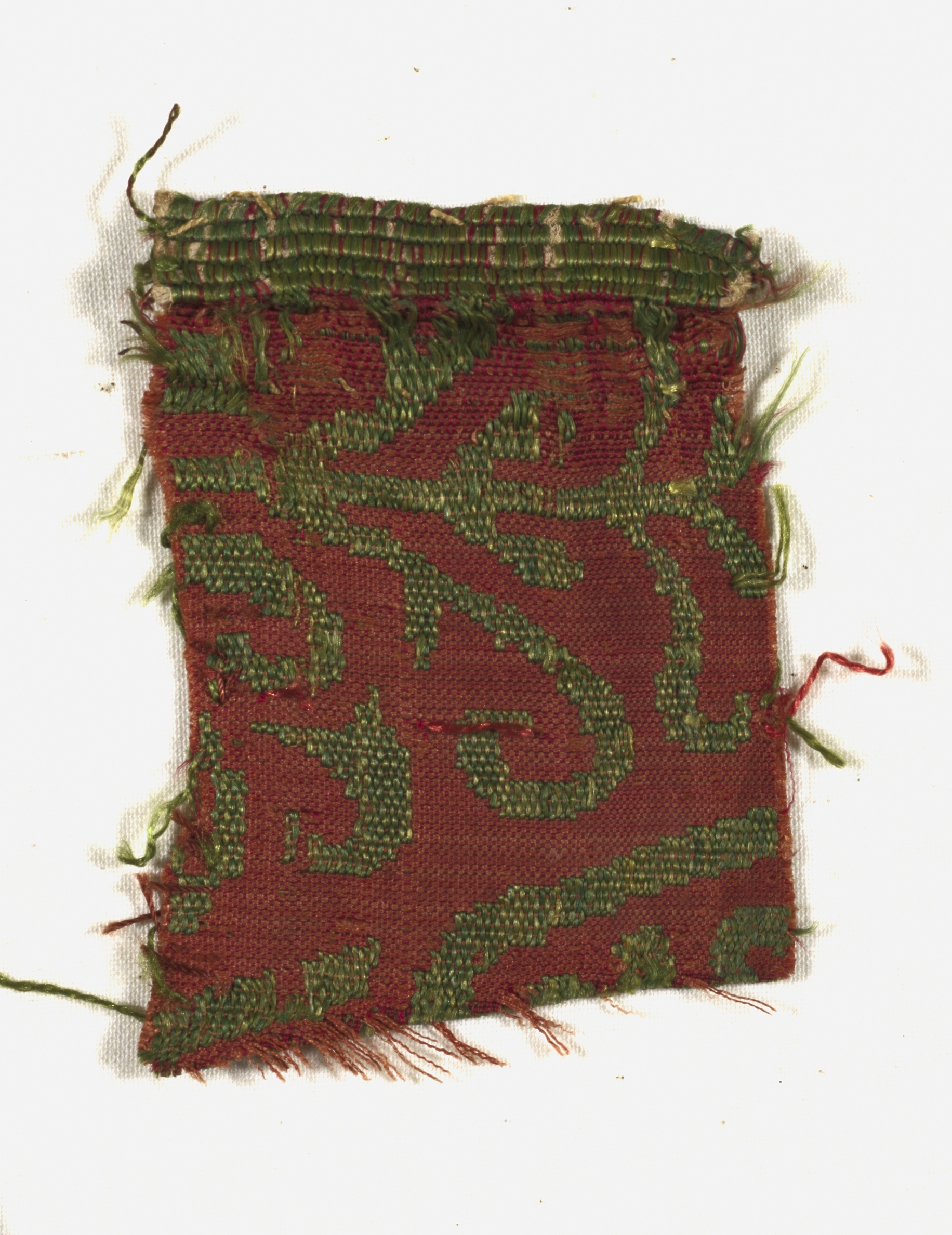 The Silk Fragment by artist unknown, is a rectangular piece of fabric with frayed edges. The fabric has a red background and features a green floral pattern. The top edge has a green border with a pink and white stripe. The fabric appears to be made of silk and has a woven texture. The background behind the fabric is white.