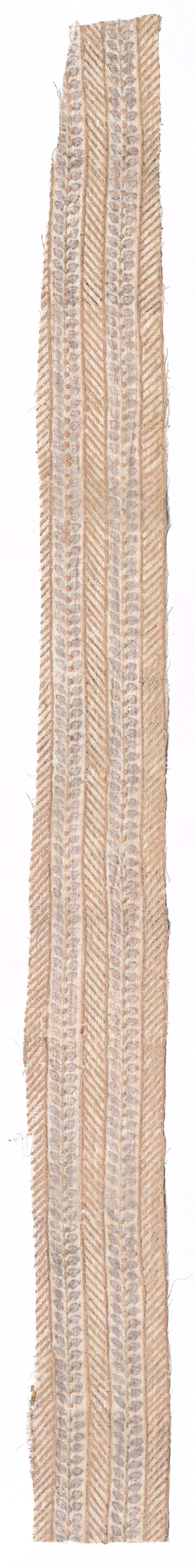 Tan and gray woven fabric with stripped pattern. The fabric appears to be long and thin. The fabric has a rough, frayed edge on the left side. The background is white. "Fragment" by artist "Anni Albers".