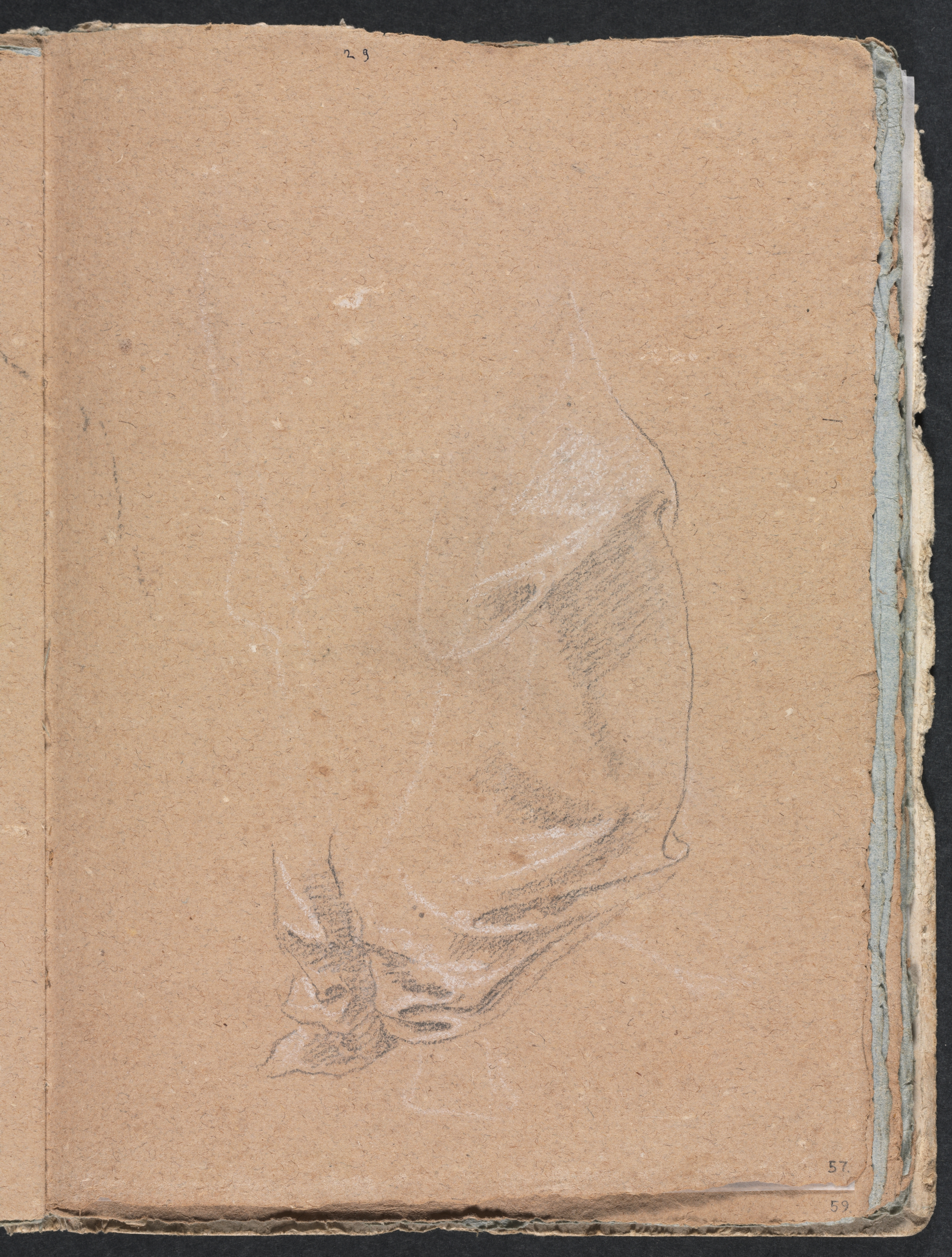 Brown paper with a sketch of drapery. The sketch is in pencil and appears to be a study of folds in fabric. The paper is part of a book or sketchbook, with a rough edge on the right side and a vertical crease down the left side. Numbers '57' and '59' are printed on the bottom right corner. The background behind the paper is black.