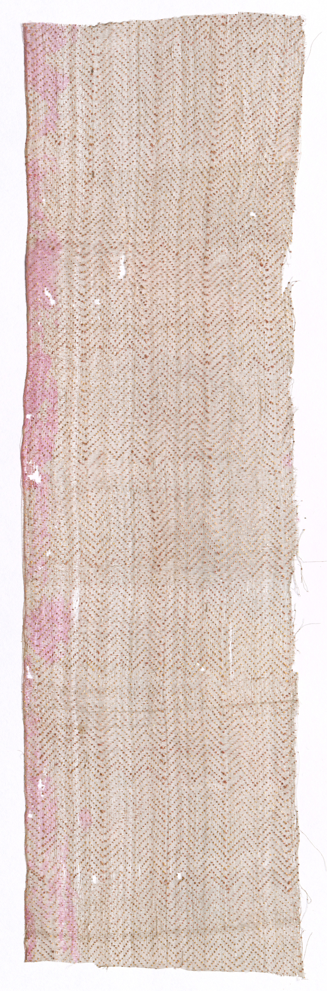 Tan-colored fabric with a chevron pattern, frayed edges, and a pink stripe along the left edge.