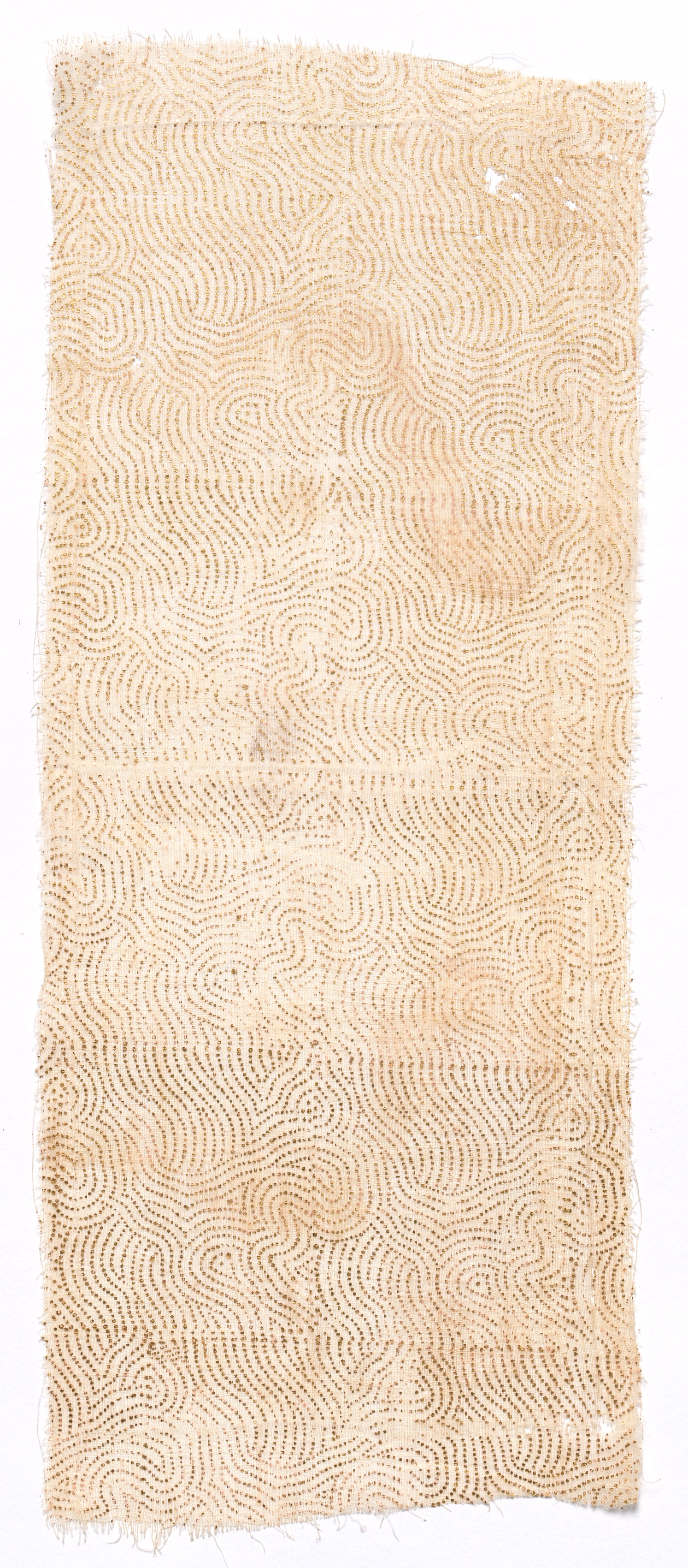Beige-colored fabric with a repeating pattern of wavy lines made from small, closely spaced beads. The fabric has frayed edges and a few small white spots. Rectangular shape with a slightly uneven top edge. The background behind the fabric is white. Fragment of Draped Court Apparel by an unknown artist.