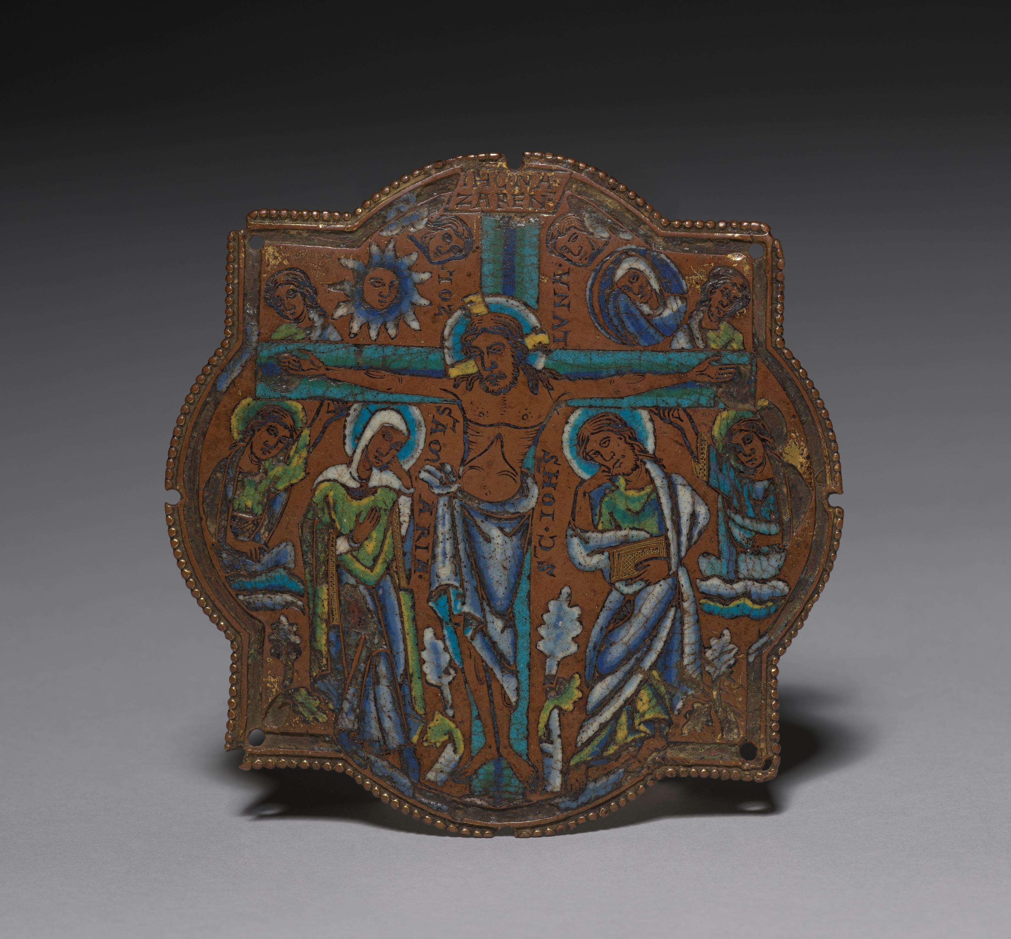 Enamel plaque depicting a crucifixion scene. The plaque has a brown background with a blue and green design. It is shaped like a rounded shield with a decorative edge. The crucified figure is centered on the plaque with a halo around the head. The figure is wearing a loincloth and has a blue and white robe draped over the body. The hands are nailed to the cross and the head is tilted to one side. There are several other figures around the central figure. Two men on either side of the cross have halos and wear robes. The man on the left has a green tunic and blue pants, and holds a cloth. The man on the right has a green tunic and blue pants. There are additional figures at the top of the plaque. The top center has a blue and green design with text on either side. The text is in black. The border of the plaque has a decorative edge with small bumps. The plaque appears to be made of metal with enamel details. The background of the image is a gradient from dark gray to light gray.