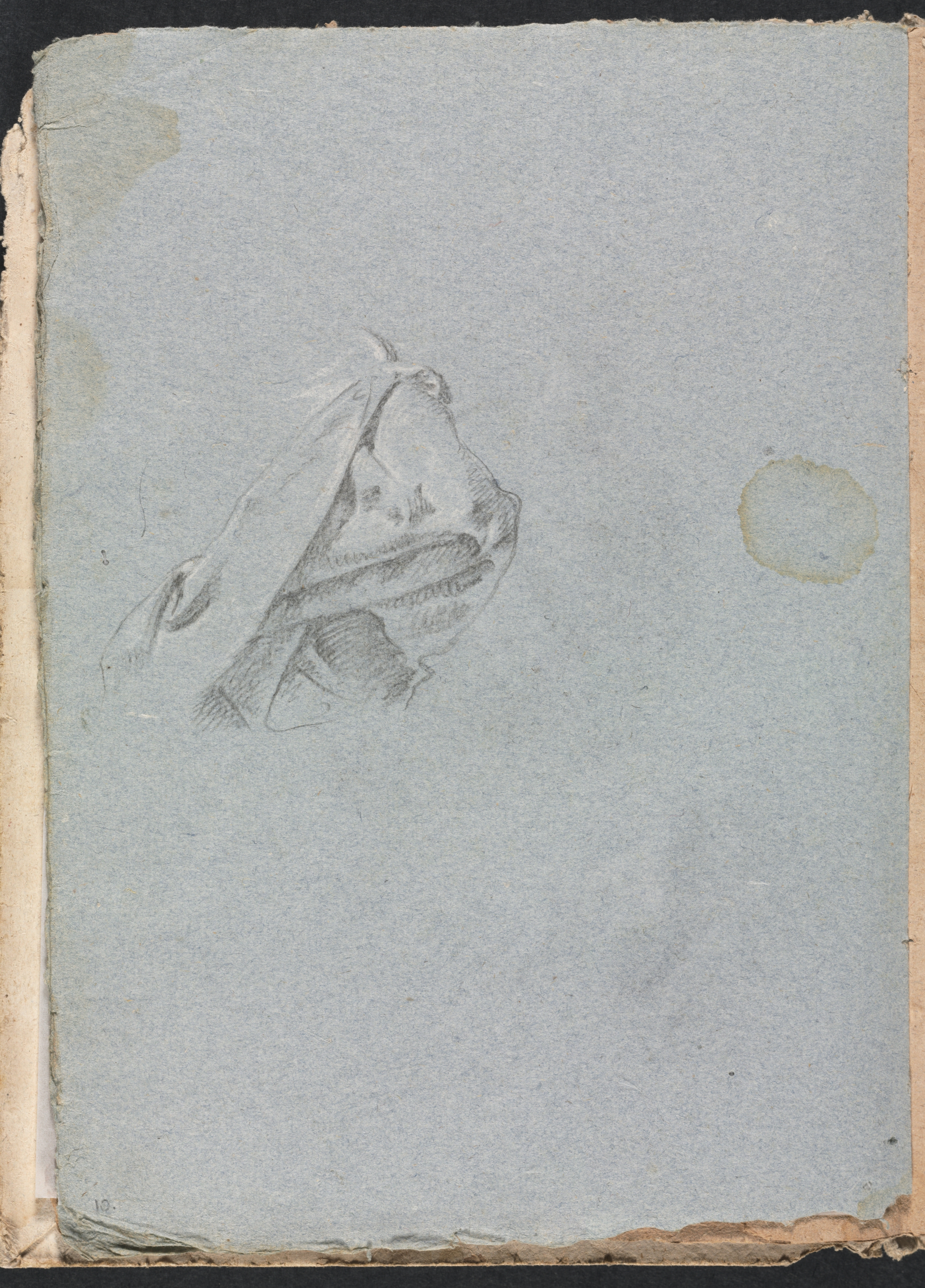 A sketch of draped fabric on blue-gray paper. The fabric appears to be folded and hanging, with creases and folds drawn in pencil. The paper is aged, with a rough texture and torn edges. A small stain is visible on the right side. The page number "10" is written in the bottom-left corner. The background behind the paper is black.